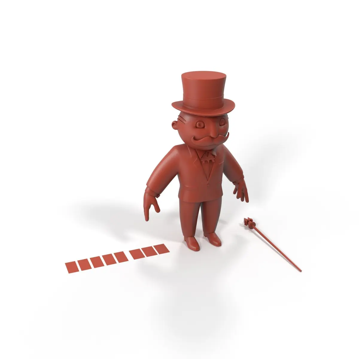 Mr Monopoly A-pose for 3D Print is a high-quality 3D model, ready to be used for 3D printing projects. The model's geometry is solid, allowing the forms and details to be replicated excellently in a 3D print. The product renders were created in 3Ds Max with V-Ray to demonstrate how the model may look with materials applied. The renders have no post-processing!