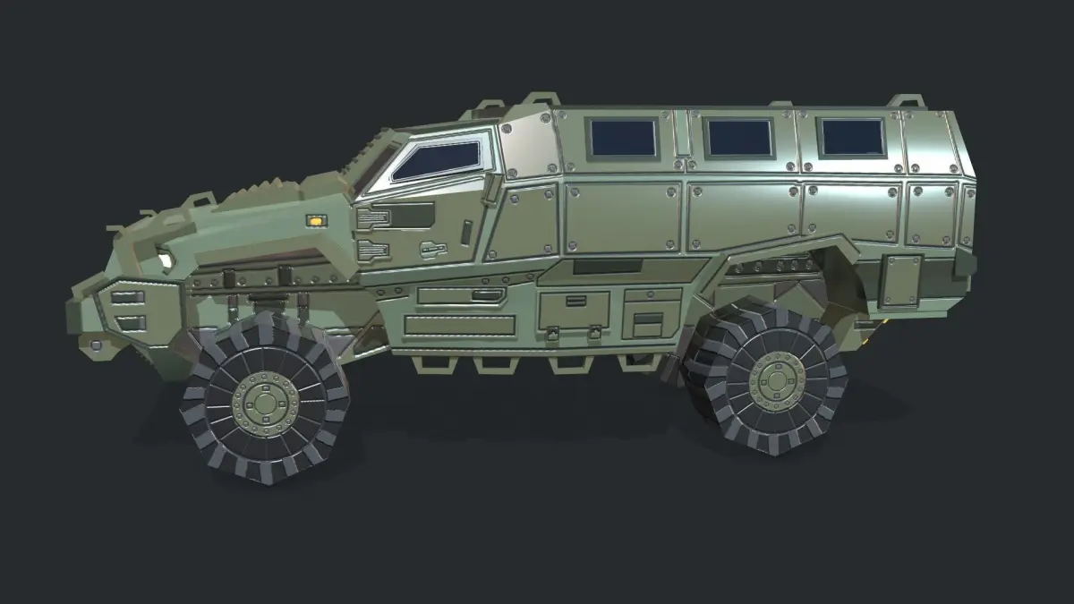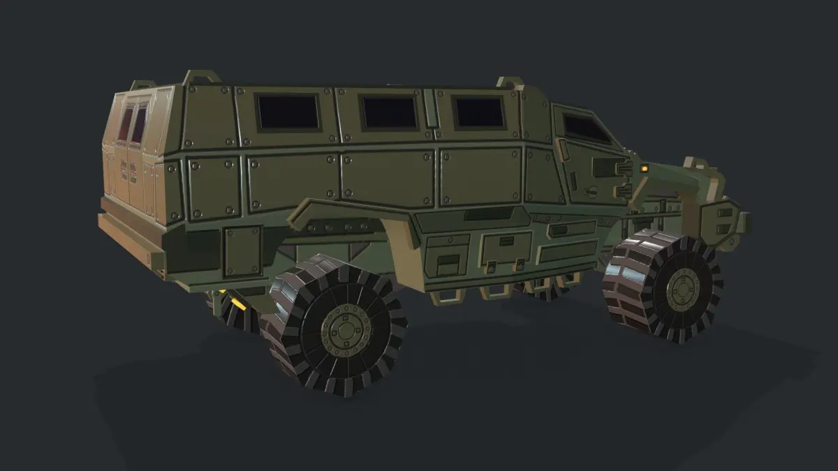 An MRAP Armored Vehicle low poly style ready for a Game Engine ideal for an RTS Game it has 1802 Verts 3149 Edges 1448 polys and 2748 tris the textures are 2 k and PBR included Diffuse, Emissive, Metallic, Normal, Roughness Maps. if you need 3D Game Assets or STL files I can do commission works.