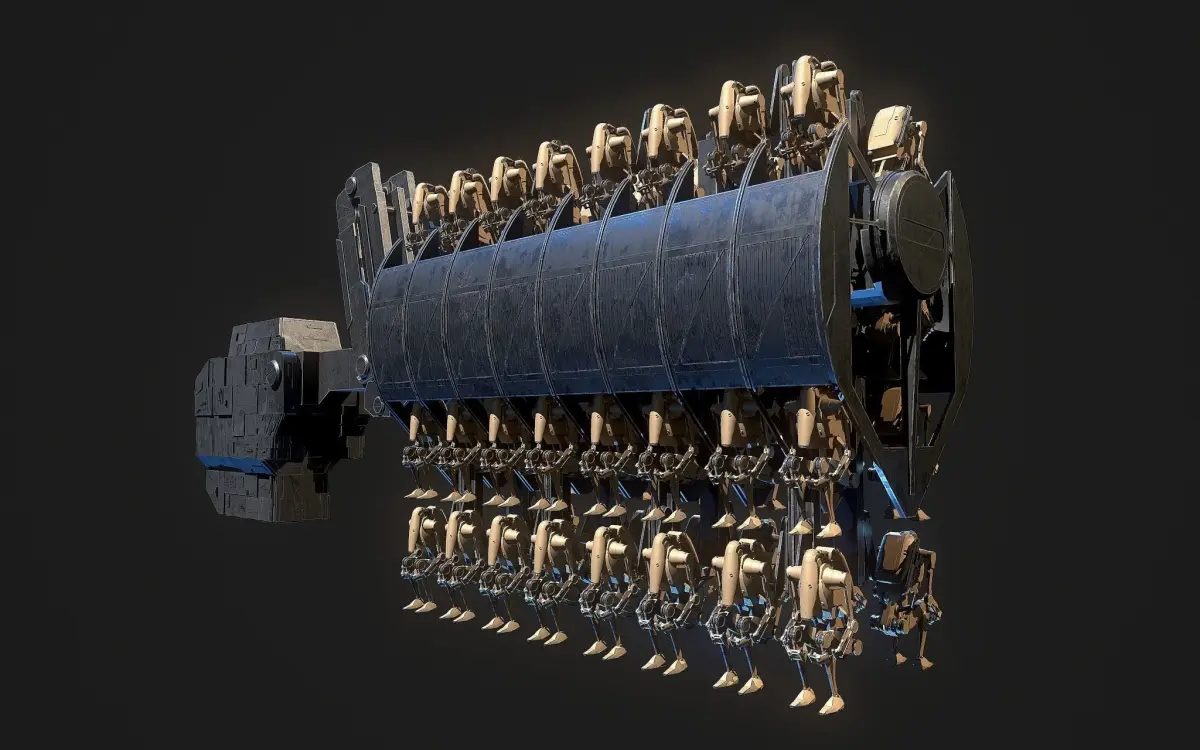 A terrifying display of Trade Federation efficiency, the mammoth MTT (Multi Troop Transport) is an armored giant capable of disgorging over a hundred battle droid soldiers into the thick of combat. The vehicle's bulbous armored front end opens to reveal an articulated deployment rack, upon which rest dozens of compressed battle droids. The rack extends forward and deposits the droids into neatly organized rows.