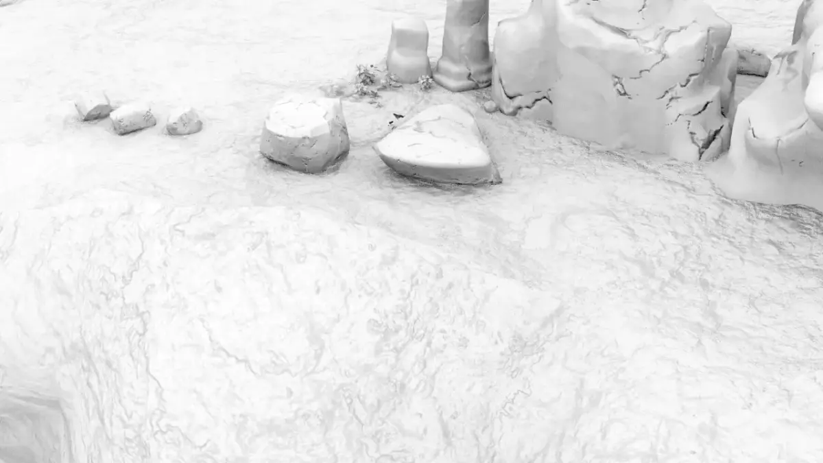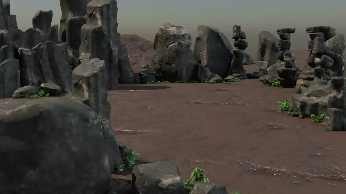 A realistic 3D model of a muddy dirt road with tire tracks, small puddles, and uneven ground. The road should have some grassy edges, scattered stones, and signs of erosion. Lighting should be natural daylight