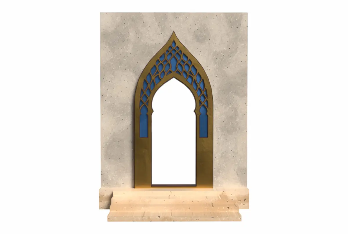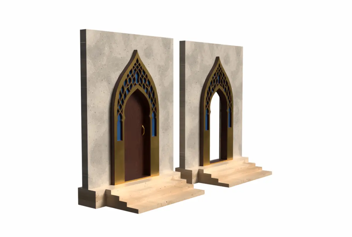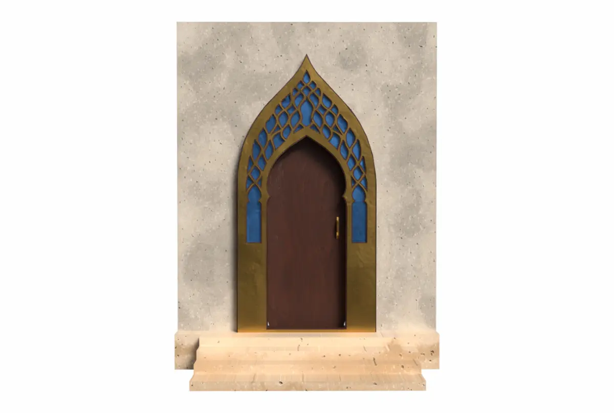 - Arched Wooden Door: Ornate latticework with a golden frame.