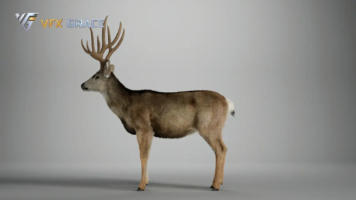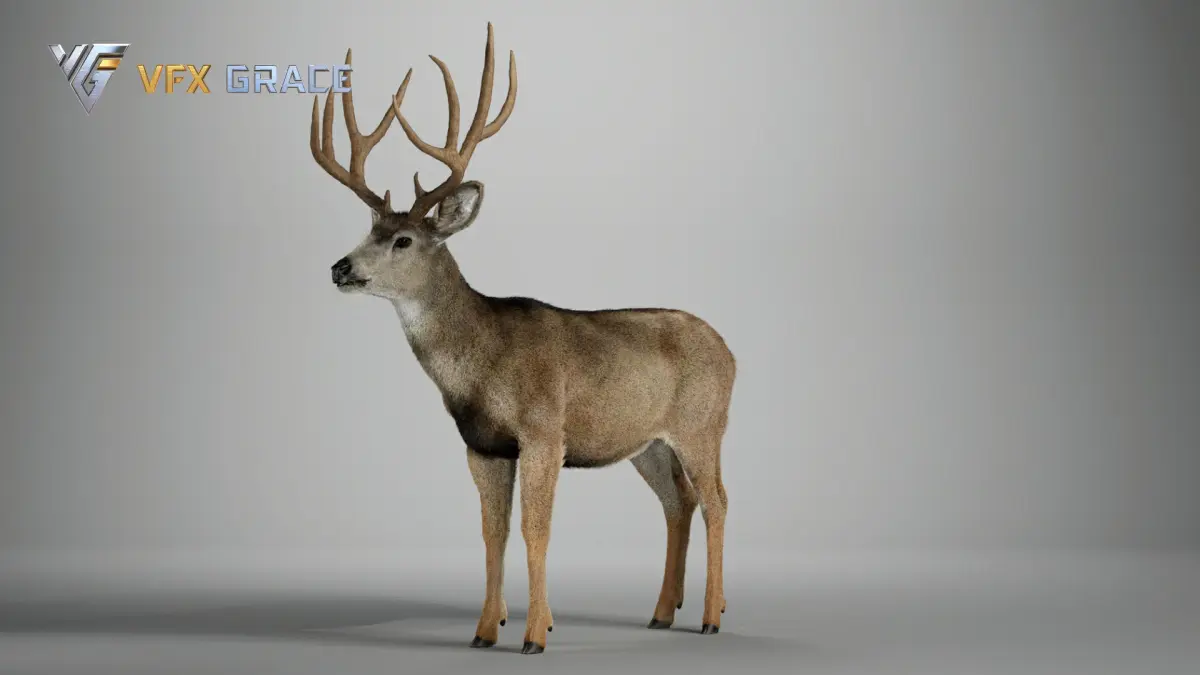 Groom Fur: A complex fur system was created in Blender, and the mule deer's fur styling has been perfectly replicated using UE's Groom technology, with finely tuned materials.