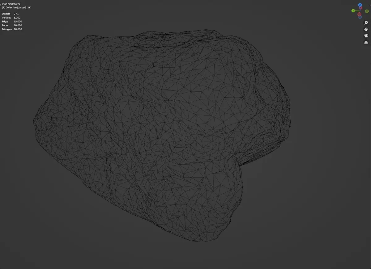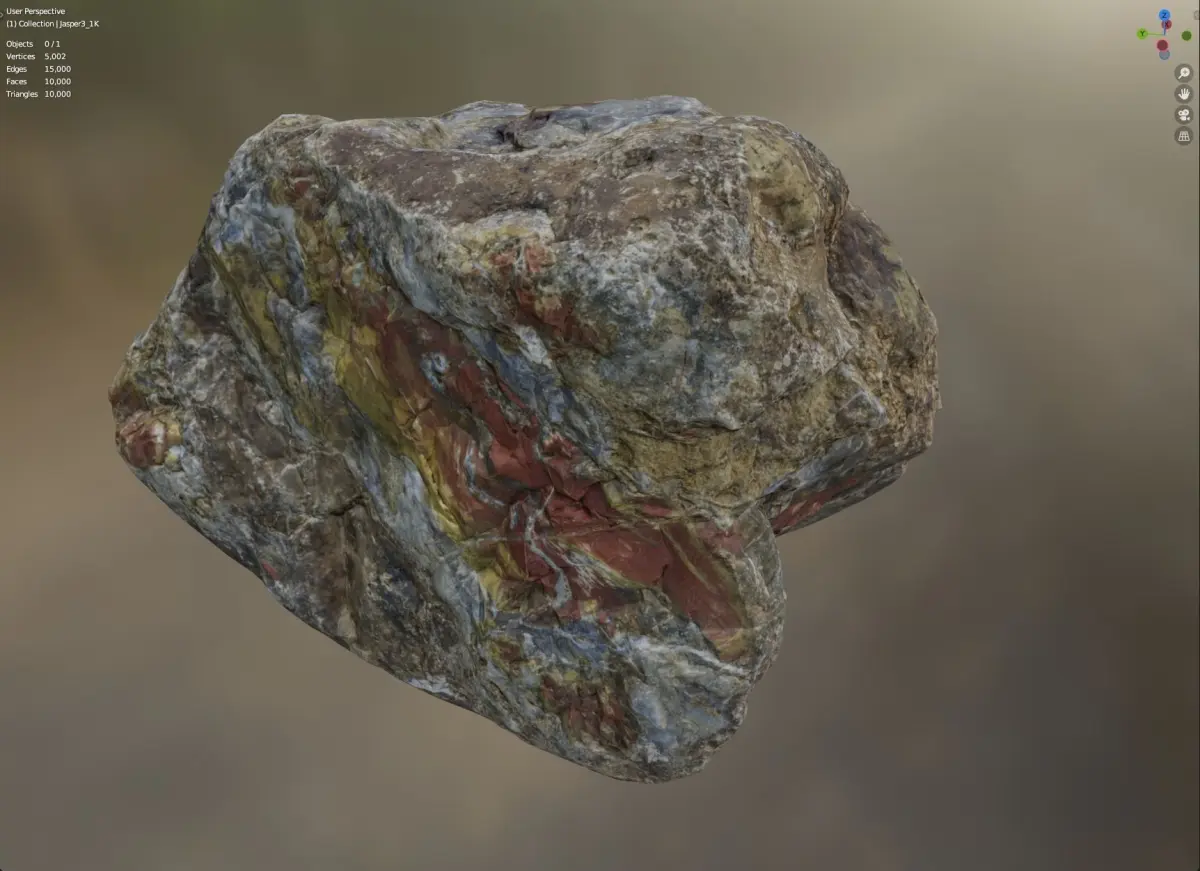 Photorealistic multi-colored Jasper made from Photogrammetry. 8K Texture Files : Color, Normal, and Ambient Occlusion. Model origins are centered by mass. Models are provied as FBX and OBJ for maximum interoperability with 3d programs and game engines. LODs are available with the following face counts: 500, 1K, 5K, 10K, 200k, 2Mil, 15Mil