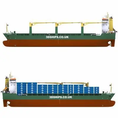 Multi-Purpose Cargo Vessel, based on existing design. Carries bulk, project, timber, general cargoes and containers worldwide.Lenght: 142.81 mBeam: 21.50 mDraught: 9.71 mGT: 11894 tCargo Cap: 17490 tContainers: 962 tueMain Engine: 7800 KilowattsCranes: 3 X 60 t (120 t in tandem)