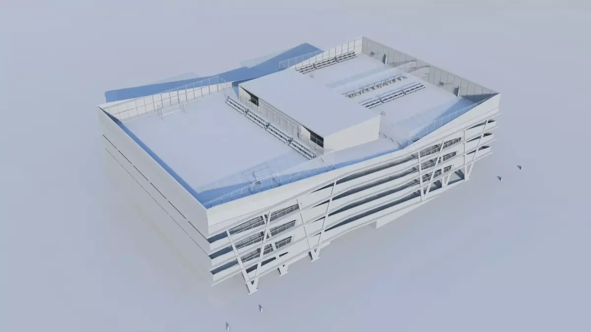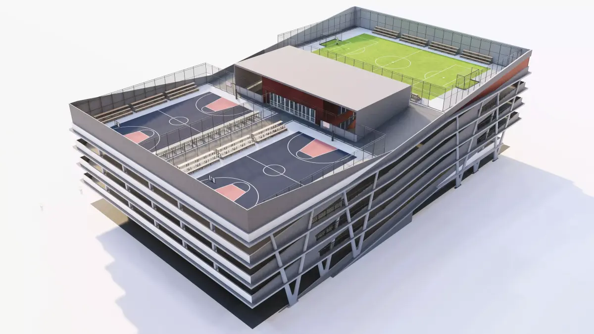 This is a high-detail 3D model of a Modern Parking Plaza, featuring a unique Rooftop Sports Facility. This asset is ideal for architectural visualizations (Arch-Viz) focusing on urban density, commercial developments, or municipal infrastructure projects.