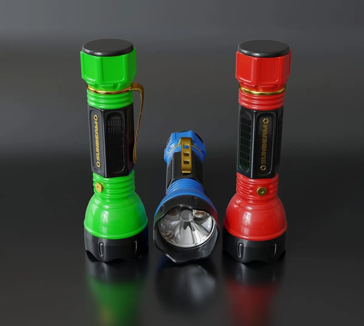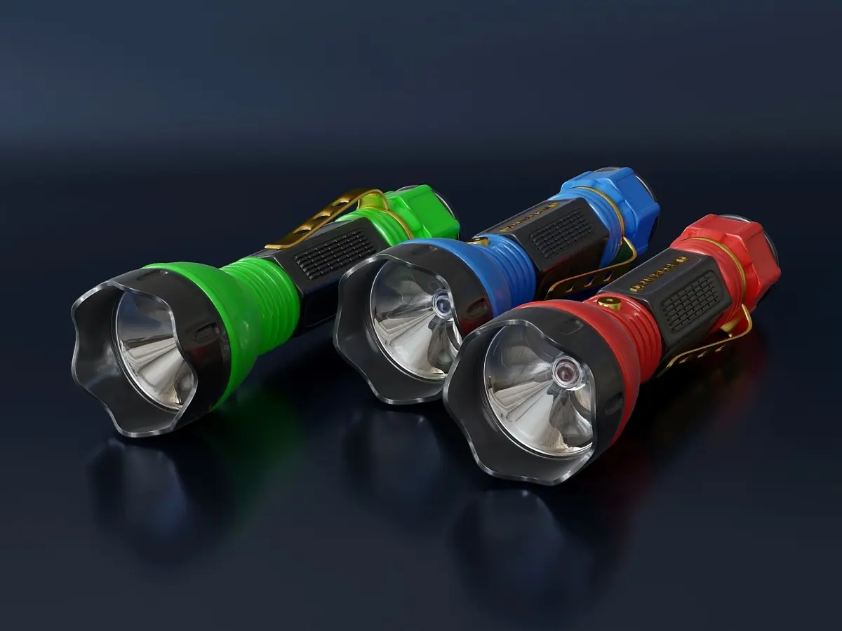 Multi-colored hand-held plastic lanterns. The set contains three identical flashlights in different colors. All details of the model are combined into one object (three flashlights - three objects) No textures were used in this model.(The number of polygons indicated in the description is three flashlights combined)