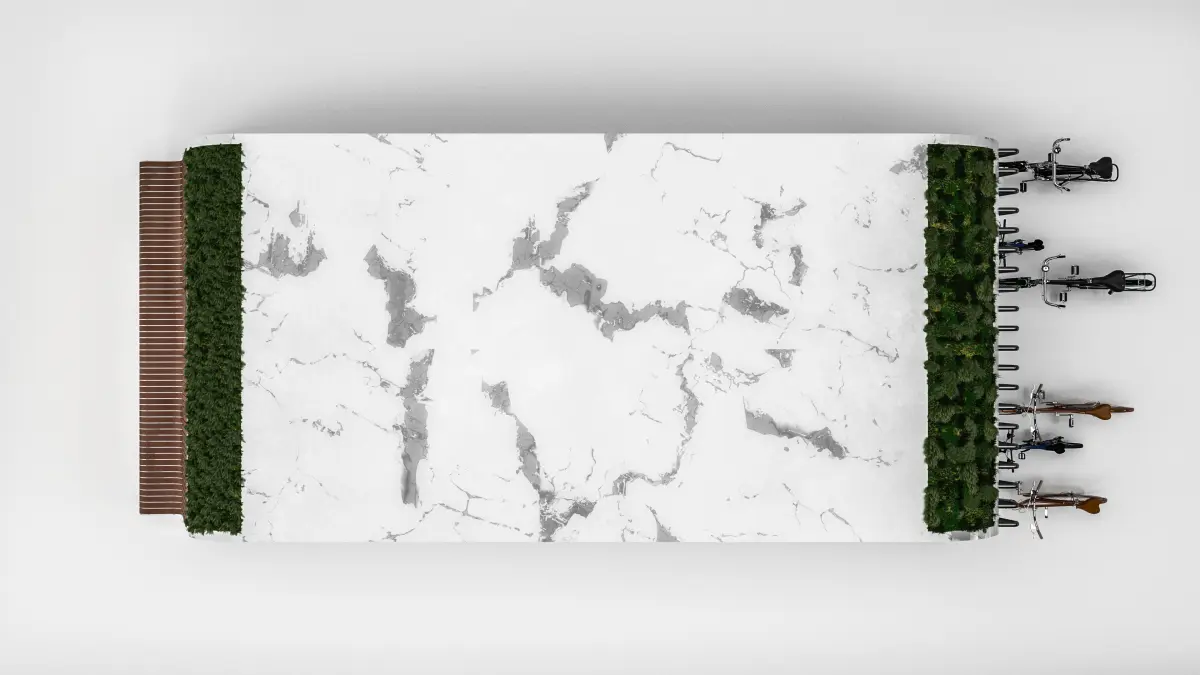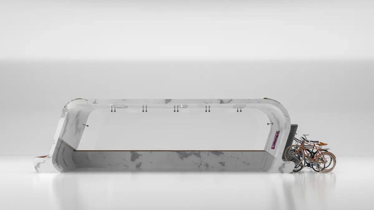 The stop complex is a covered part for public transport passengers and an open part on both sides. The covered part protects people from wind, precipitation and the scorching sun. On it you can expect transport both sitting on benches and standing. On the inner sides of the complex there is a place for advertising. The stop complex is also illuminated from the inside of the roof.On the open part of the complex on two sides, where the roof goes into the side panel, there are green lawns, which will additionally provide clean air for people waiting for transport. And just decorate the front of the bus stop.On the left side of the complex there will be a bench for those who want to enjoy the air and light breeze, as well as bask in the sun. On the right side there is a bicycle parking for those wishing to use a bicycle.
