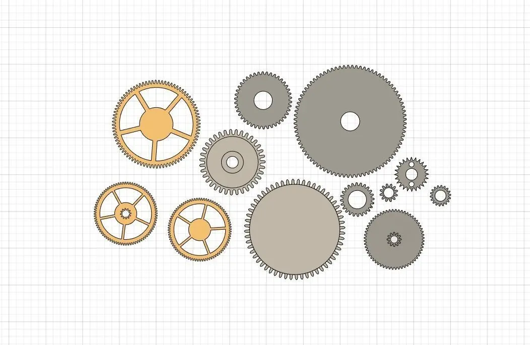 A wide range of gears is available, including spur gears, bevel gears, and sequential gears.