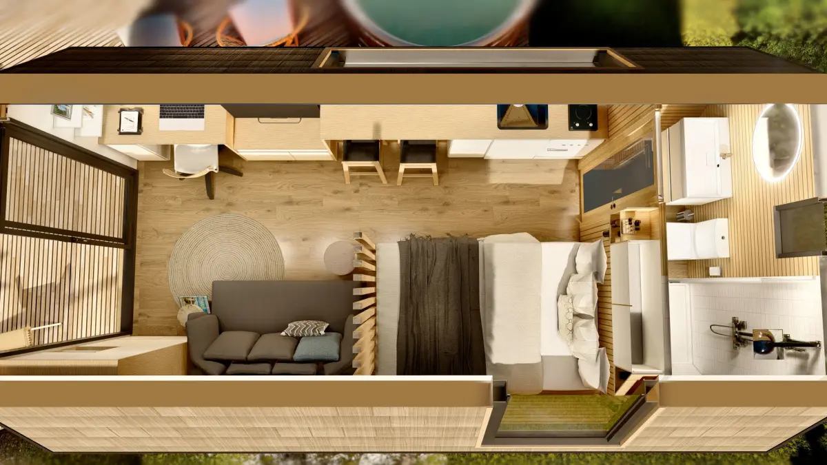 Modern designed glamping pod, tiny house, vacation house with a firepit , hot tube and fully furnished interior,lot of glass walls and glass roof windows... can be produced in Slovenija and can be ordered and placed any where in europe. Or you can build it yourselve ; i added basic autocad file (DWG, NOT PDF) . Highly detailed 3D model with lot of useful 3D models and furniture in it, contains big closet at entry , working space with drawer and computer table, intertaiment part with tv unit , kitchen part with table, sink, fridge, induction, bed, toilet , wc, shower.. . Plus firepit , hot tube and dog kennel.