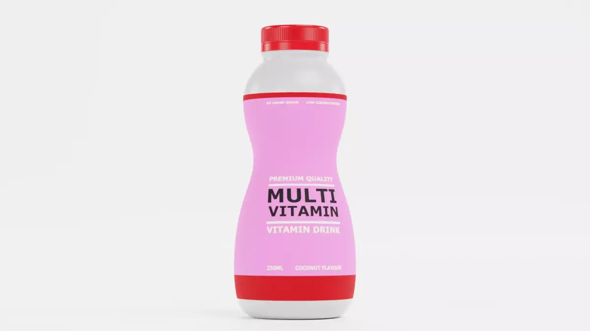 A realistic 3D model of a Multivitamin Drink bottle designed as a brand-neutral supplement container with clean proportions and a production-ready look. This concept emphasizes modern, minimal design and accurate form factor, representing a timeless, professional packaging aesthetic for sport nutrition packaging – without any brand association.
