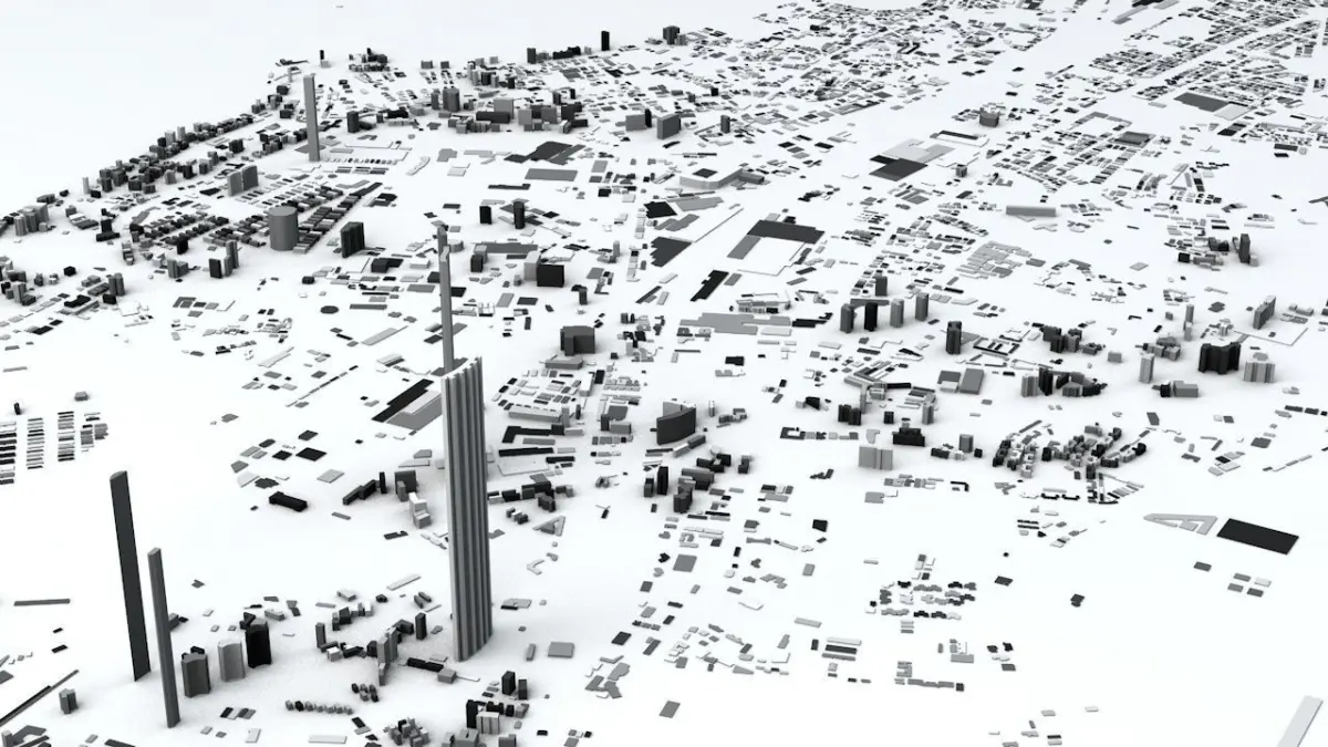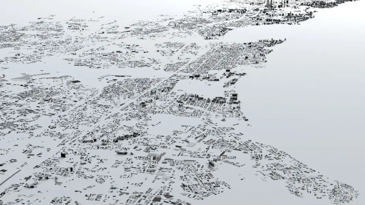 - the model is positioned on a flat surface (all buildings are on the “floor” - no elevation data included)