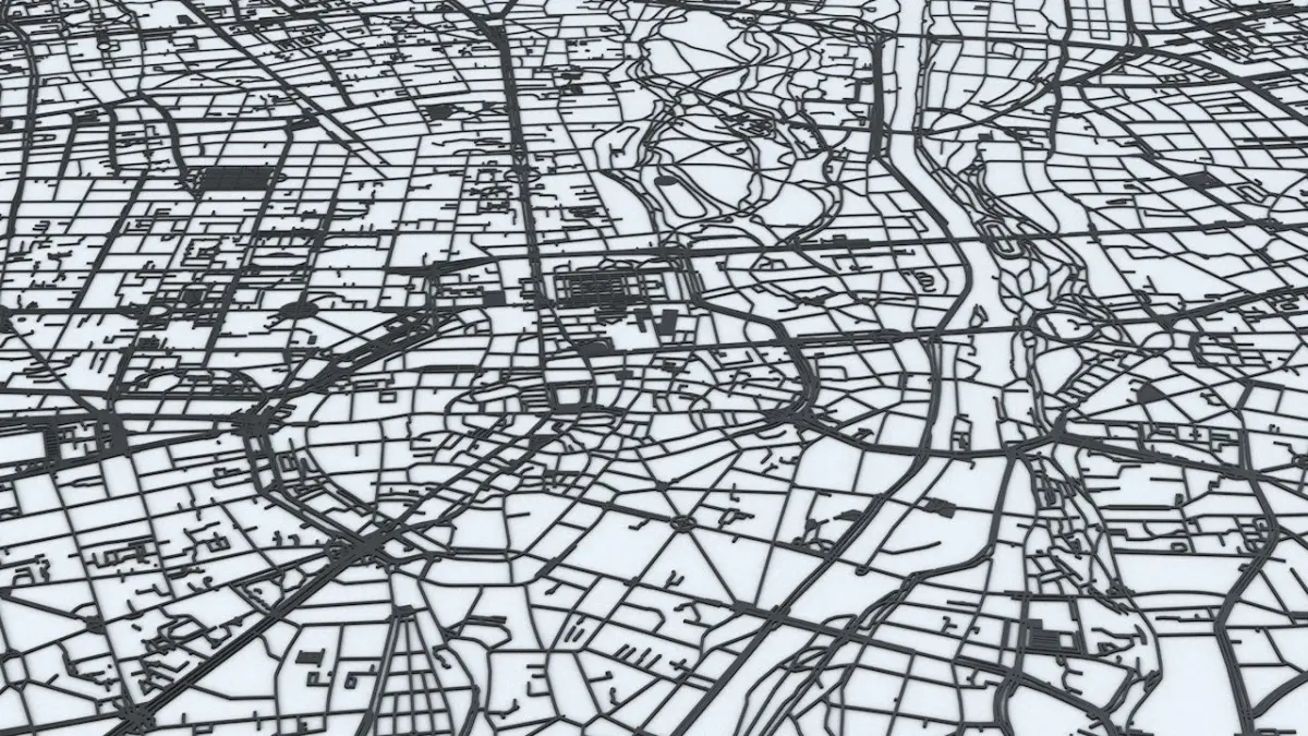 - the model is positioned on a flat surface (road network is on the “floor” - no elevation data included)