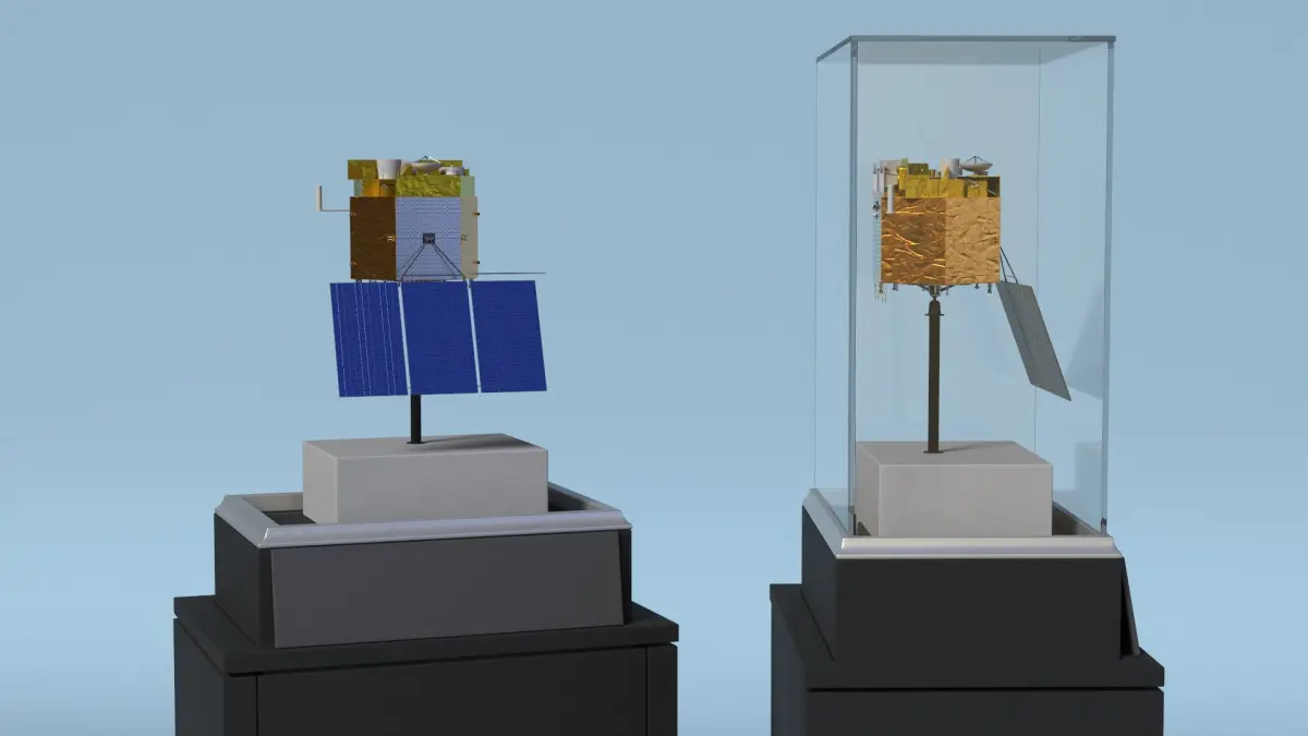 Chinese meteorological satellite, displayed in a transparent museum exhibit container with a special pedestal or stand. Fengyun is a series of meteorological satellites developed by China to monitor weather patterns, climate changes, and environmental conditions. These satellites provide crucial data for weather forecasting, disaster prevention, and climate research. The exhibit model showcases the satellite’s structure, design, and key components, allowing viewers to understand its role in meteorology and space technology. The transparent display case ensures an unobstructed view while maintaining the model's preservation.