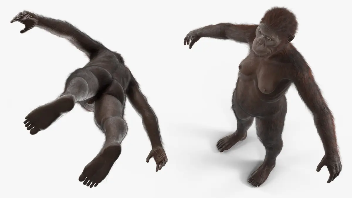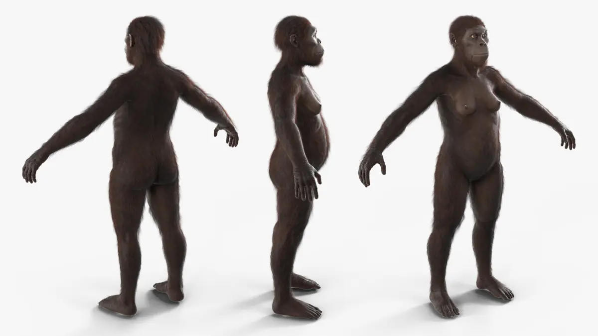 Museum-Grade Replica of Prehistoric Australopithecus Female Black Fur for Cinema 4D is a three-dimensional model of an early human ancestor, specifically designed to reflect scientific reconstructions based on fossil evidence and paleoanthropological research.