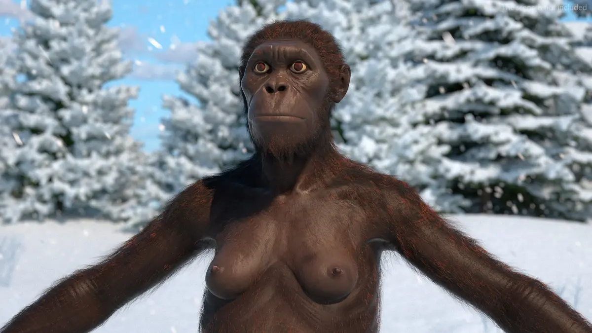Museum-Grade Replica of Prehistoric Australopithecus Female Black Fur for Mayahas a Vray Fur modifier, hair customizable (hair count, hair segments, hair color, root size, tip size, etc).
