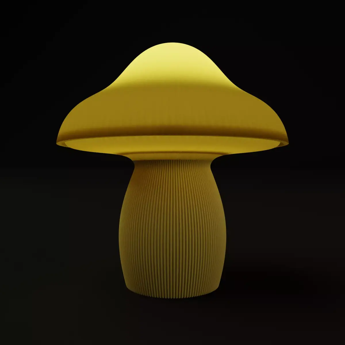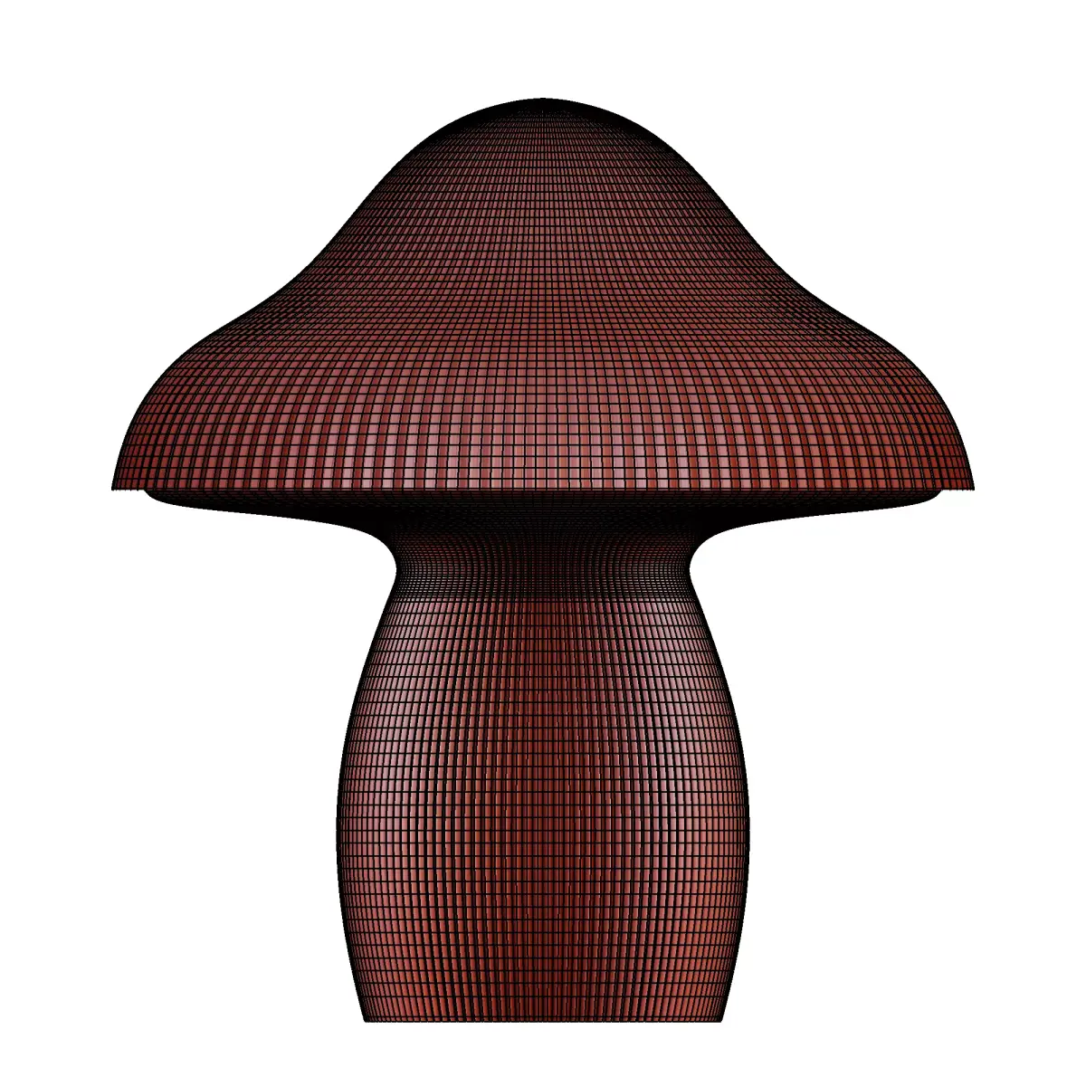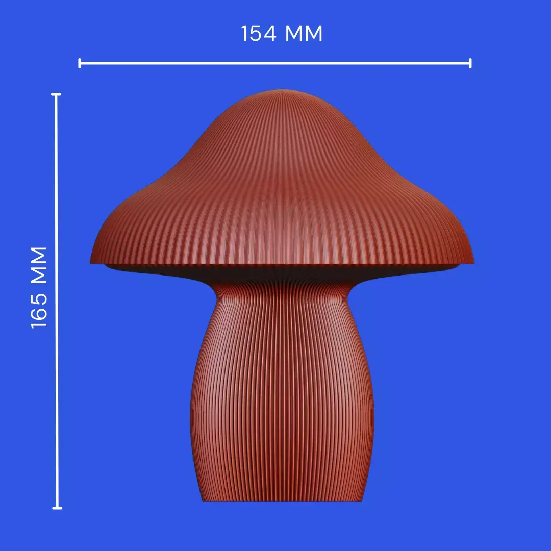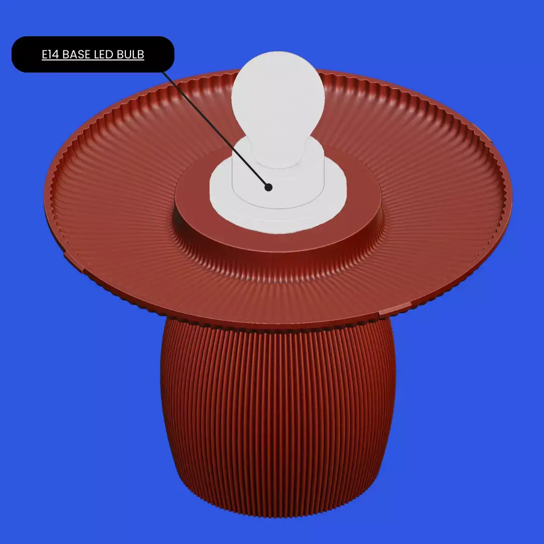 The concept of a mushroom lamp with a wavy structure. Two-piece design. The base for the E14 base has a cable slot. The top with a wall thickness of 1 mm will perfectly diffuse the light from the lamp. A good solution as a night light.