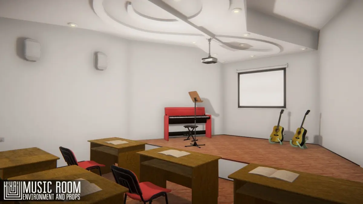 Mixaill studio presents a good solution for your games, VR projects and simulators.Music room - environment and props It is a school music cabinet with musical instruments and interior items that will help you save time on implementing your ideas.Pack includes a large set of necessary models:roomwindowdoorschool deskchairguitar with standpiano with benchprojectorscreen for projectorwall speakermusic standdouble socketilluminatorsheet music book