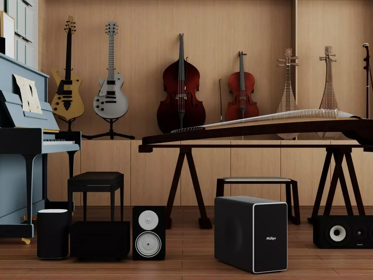 Professional music studio interior 3D model with a wide collection of musical instruments.