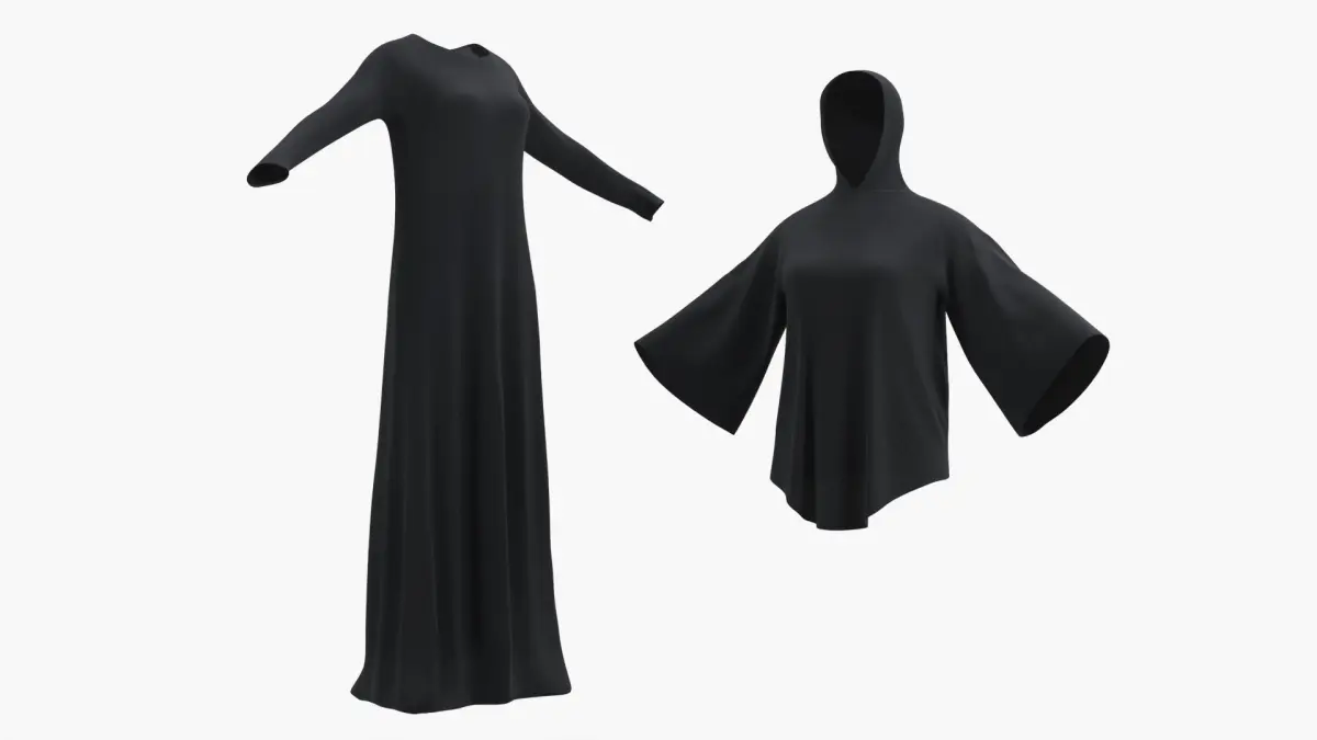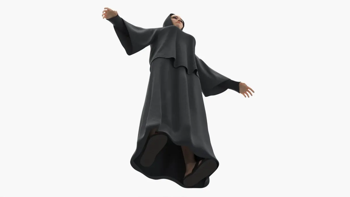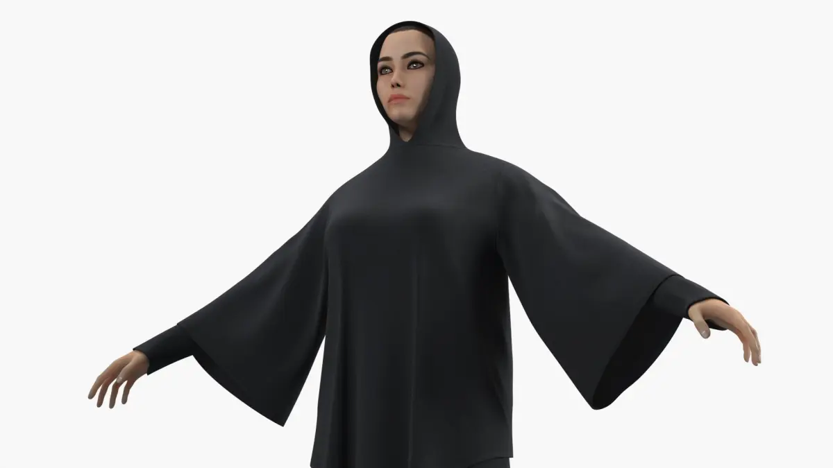 This digital outfit is designed in solid black with flowing fabric and smooth contours. The hood replaces the conventional hijab, covering the head while allowing the face to remain visible. The overall ensemble maintains religious modesty while showcasing a contemporary silhouette, ideal for visual storytelling and realistic character rendering in digital environments.