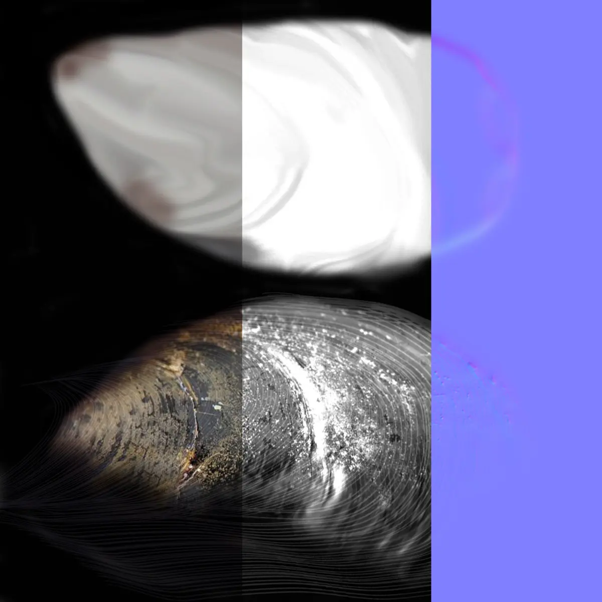 3d model of mussel. The file contains textures, color maps, bump maps, normal maps and meshes.The material is not inserted in the file. Cover images were rendered with vray materials.