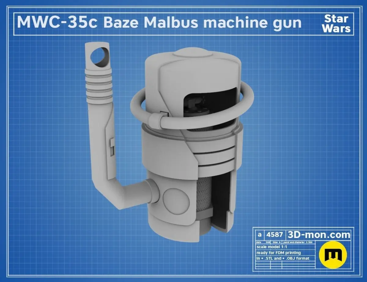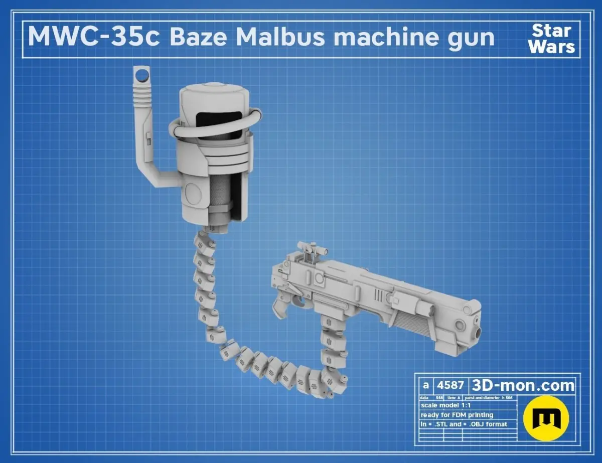 This is a digital 3D printable model of MWC-35w Baze Malbus prop with chain and his backpack.The download contains pieces of the model ready to be 3D printed on a 200 mm print bed and files that are not cut into smaller pieces. All cut parts are placed on the print bed as we would print them to save you time.It also includes 3D files to print a backpack that serves as a power source for the blaster and chain links to it.The STL files are named in the same way as the parts in the blueprint pictures to help you with assembling the blaster.
