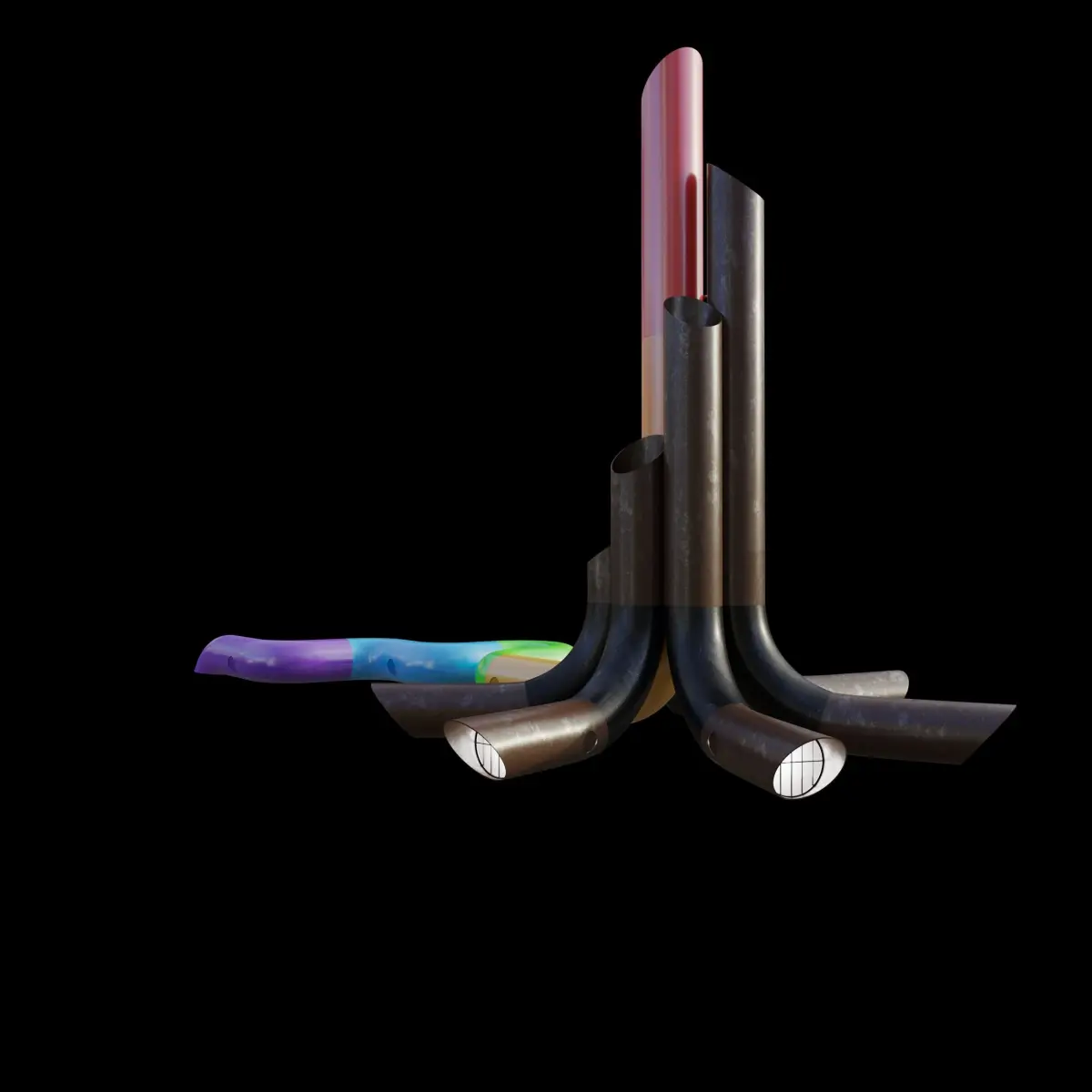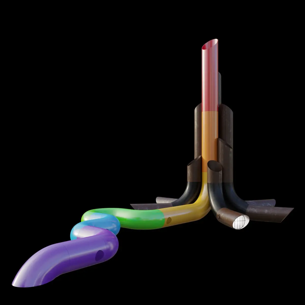 The cylinders hold sound systems that transmit audio statements made by LGBT+ activists of their experiences and the sound of their heartbeats, registered as these statements were made. These heartbeat pulses inform the algorithm that designs the pattern of the structure’s night-time lighting and the stories are played in loop, night and day. ‘My heart beats like yours’ holds the colours of the LGBT+ flag along some of the cylinders that spread out from the sculptural core and meander along the ground to serve as public seating.