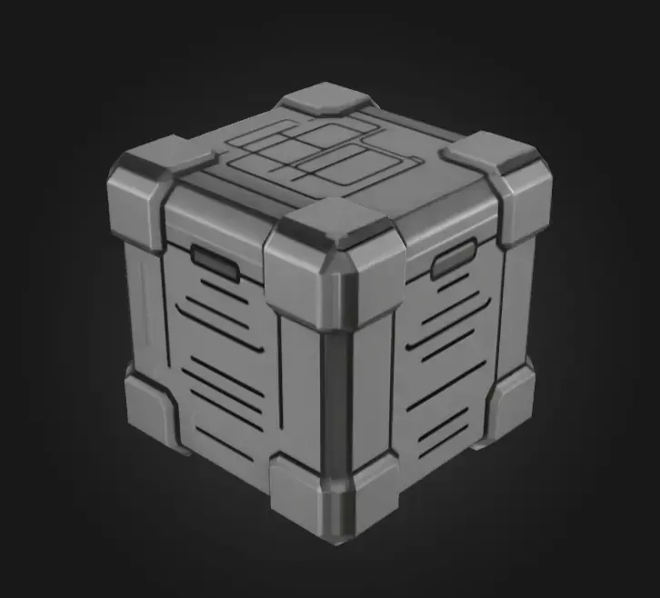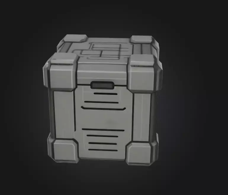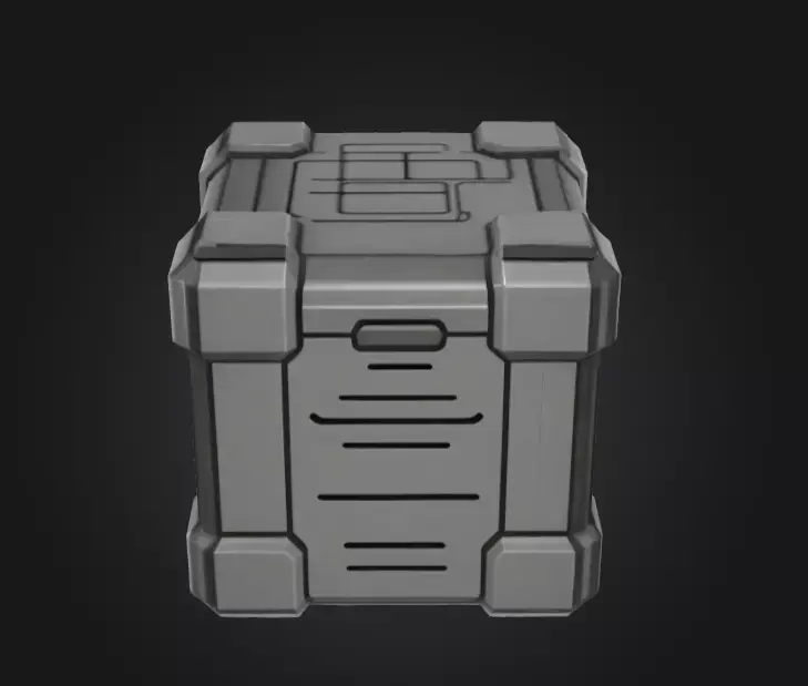 A futuristic 3D model of a mystery tech container box, designed with reinforced metallic panels, glowing accents, and high-tech locking mechanisms. The box features a sleek yet rugged design, suggesting it could hold advanced technology, rare resources, or secret artifacts. With detailed sci-fi textures and modular geometry, this container is ideal for use in sci-fi, cyberpunk, or futuristic game environments as a loot crate, storage device, or interactive prop.