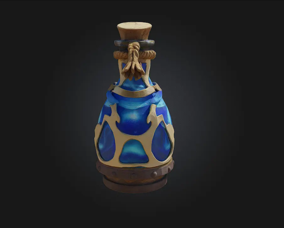 Intricately shaped glass vial with swirling magical liquid inside
