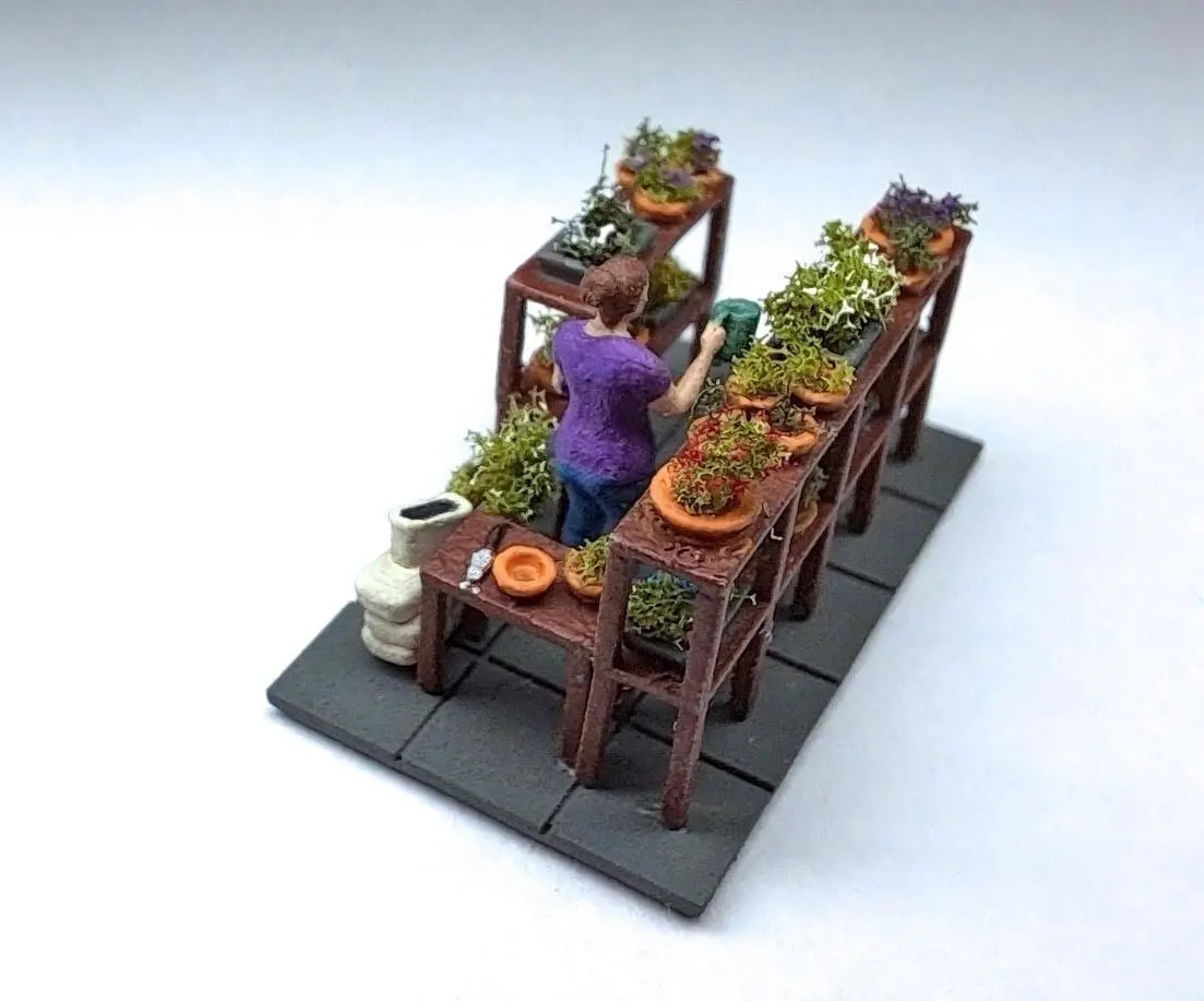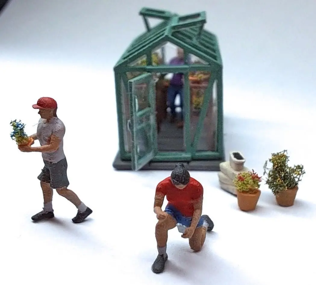 Greenhouse has interior details. I did not model plants; the details would not show in this scale. I used very small clumps of foliage and a fine wire dipped in bright paint colors to make flowers.
