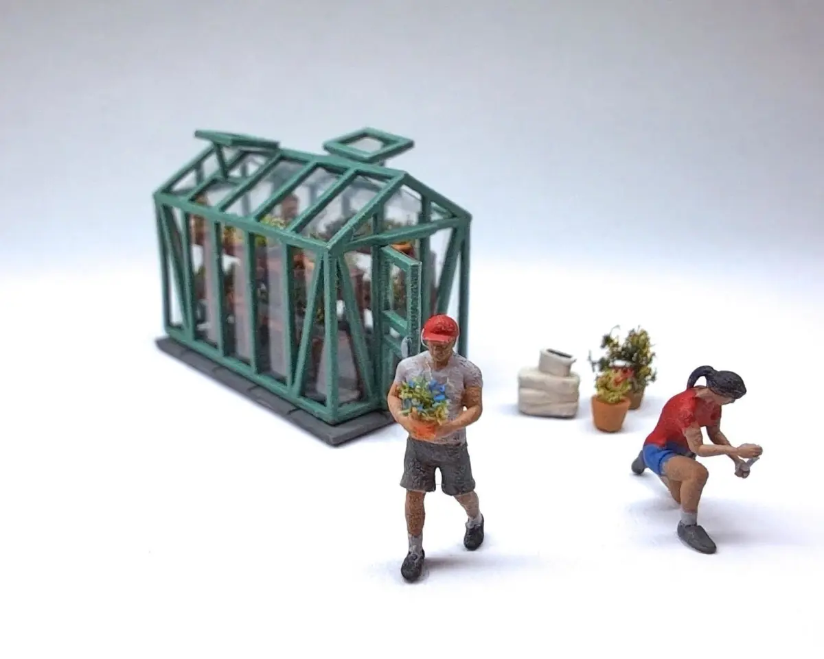 The greenhouse with glass and the windows and door can be printed in clear resin and the frame painted.