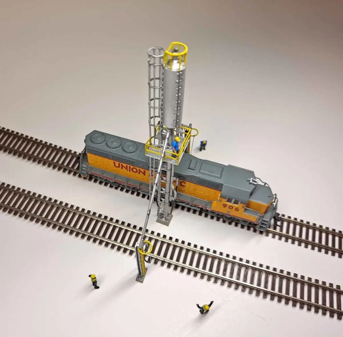 N Scale Sanding Tower can be used with one or two tracks 1.25 inches or 32 mm apart. PipeLeft and PipeRight can go on either side.