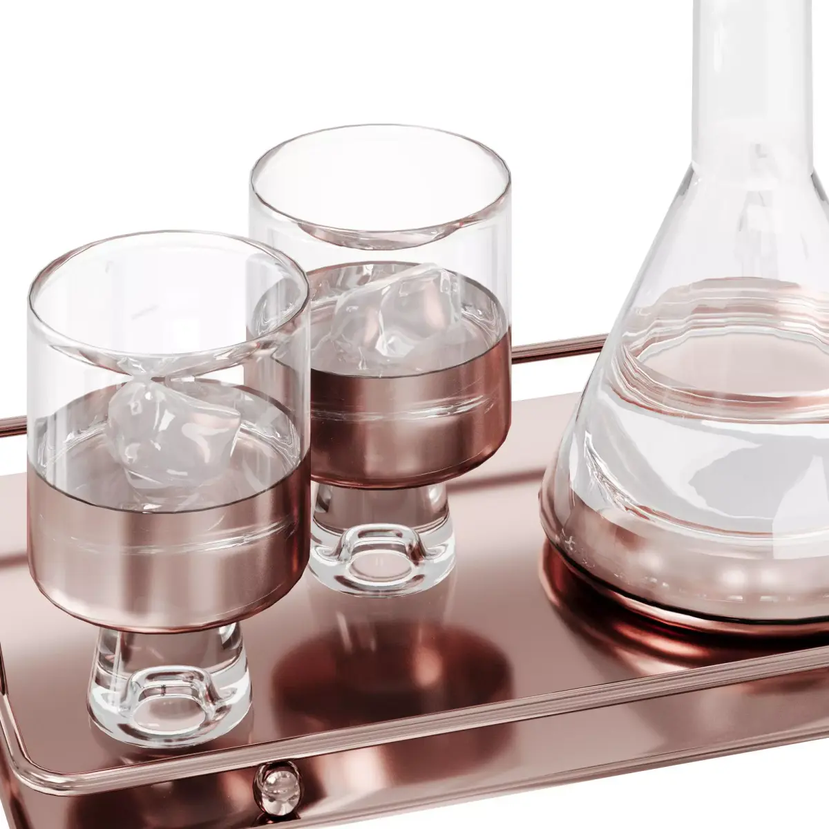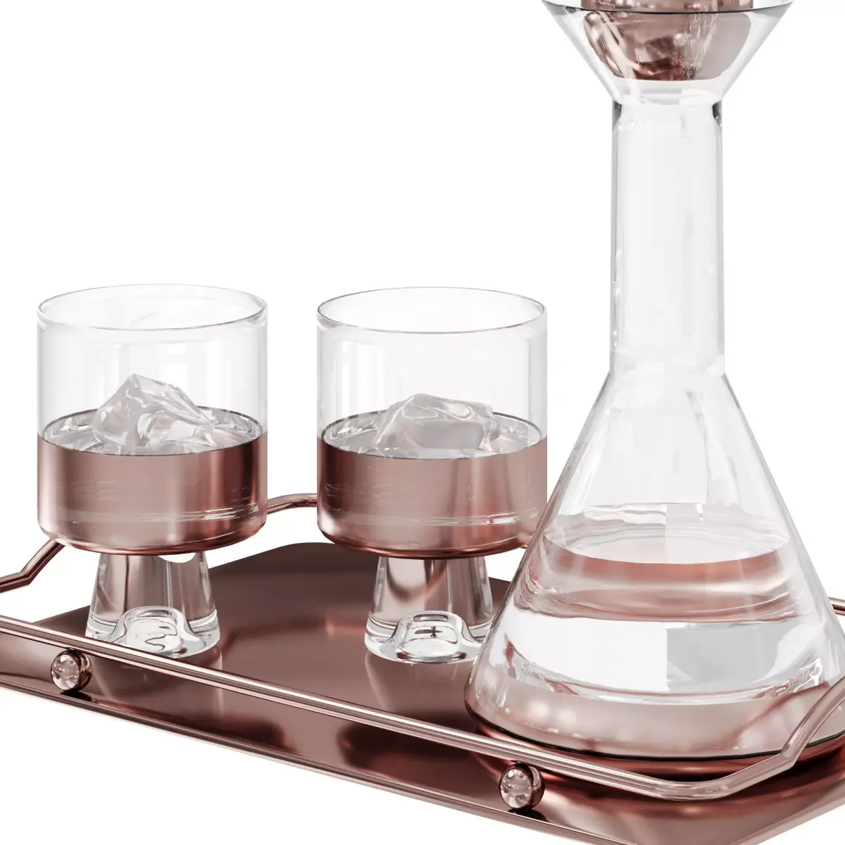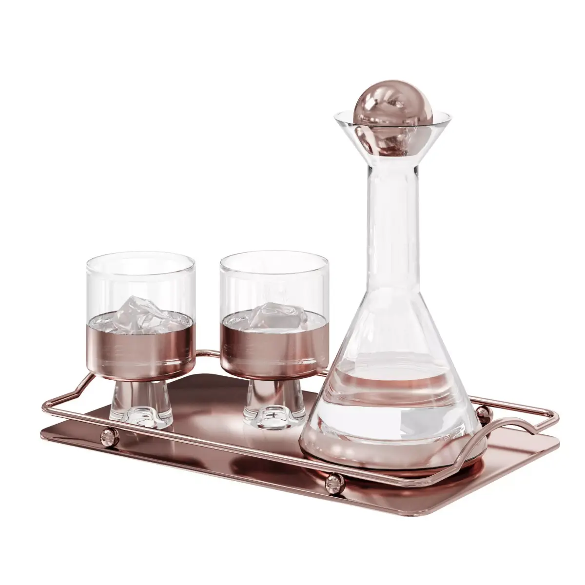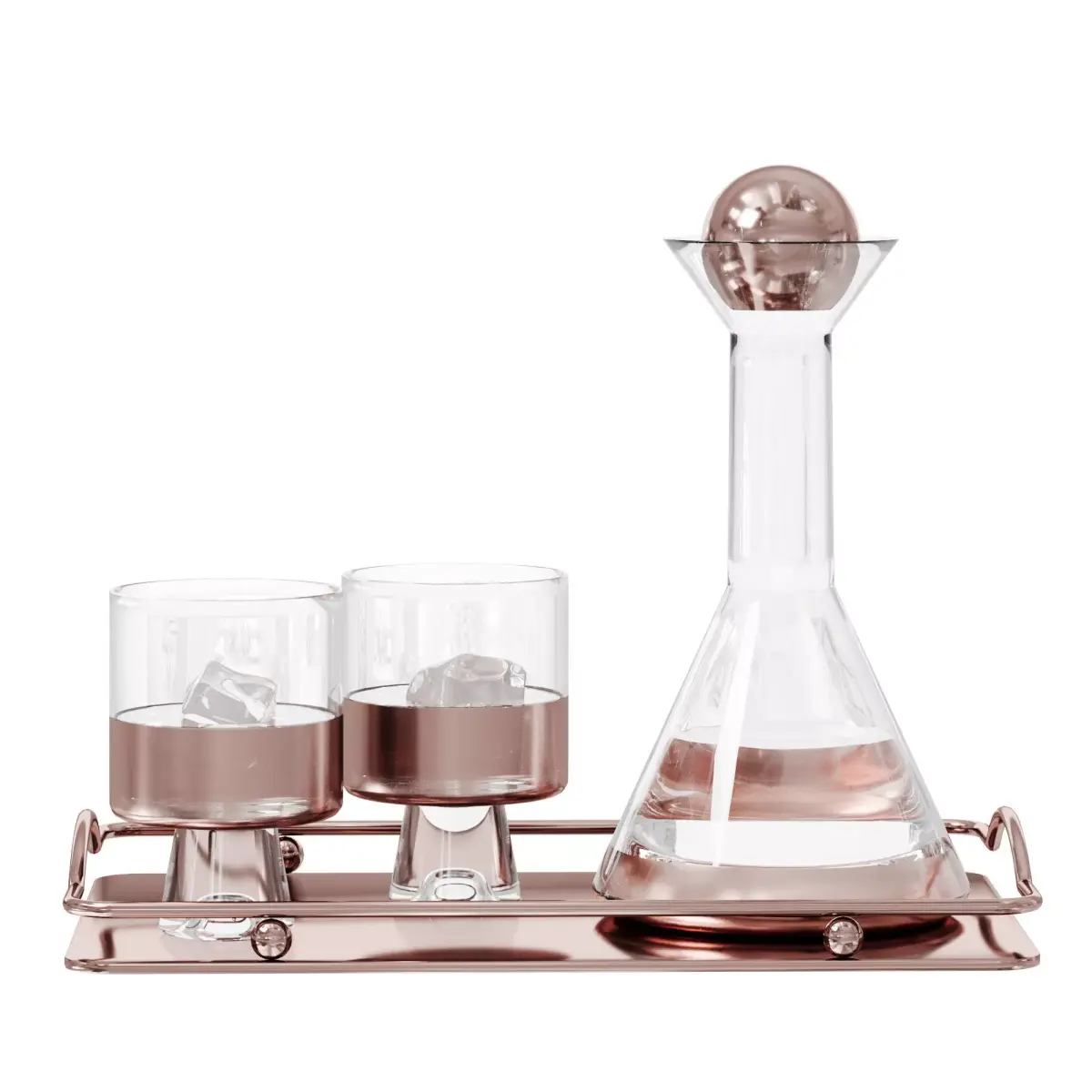 Stylized 3D model of a luxury drinkware set featuring a rose gold conical decanter with spherical stopper and two matching lowball glasses filled with liquid and ice cubes. All elements are arranged on a metallic rose gold tray with side handles. Designed for realistic product visualizations, interior renders, and cinematic bar scenes. Includes clean topology, PBR textures, and modular components for easy integration into any 3D environment.This model is available in .OBJ and .FBX formats, fully optimized for use in most 3D software and rendering engines