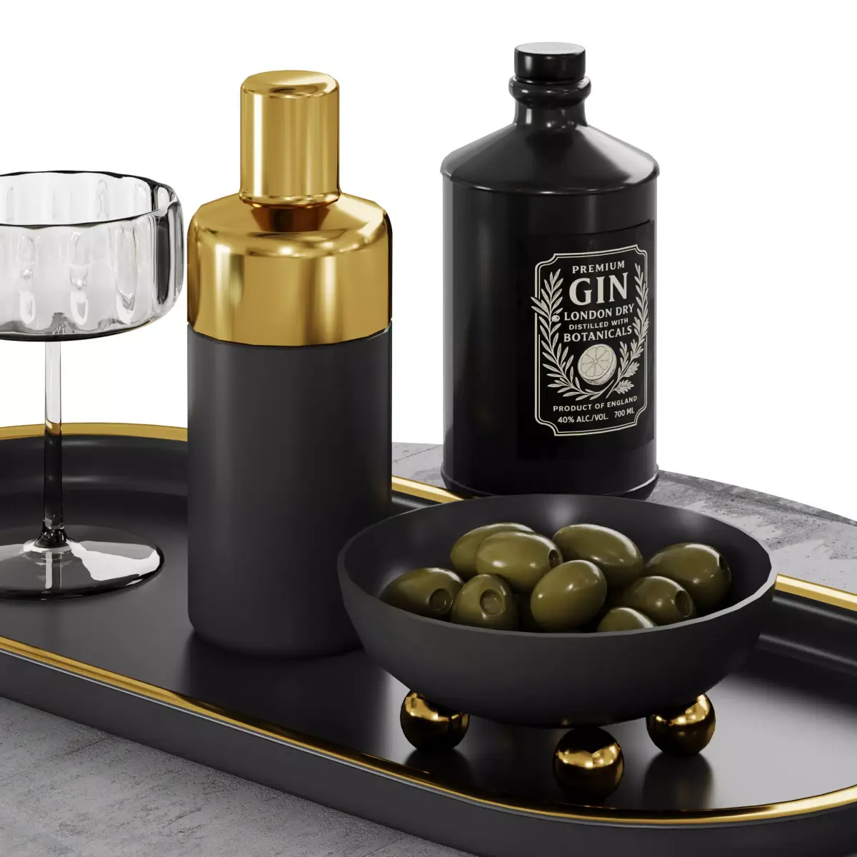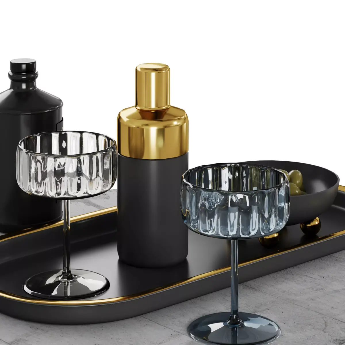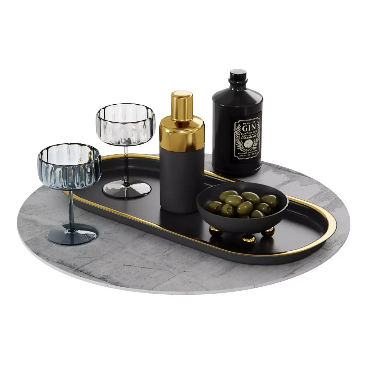 Luxurious tabletop cocktail setup featuring a black and gold oval tray with premium barware. Includes ribbed glass cocktail glasses, clear and tinted, a sleek black and gold shaker, a vintage-style gin bottle, and a bowl of green olives. Perfect for upscale branding, product visualization, or lifestyle scenes. Ideal for use in advertising, packaging, or interior design mockups.