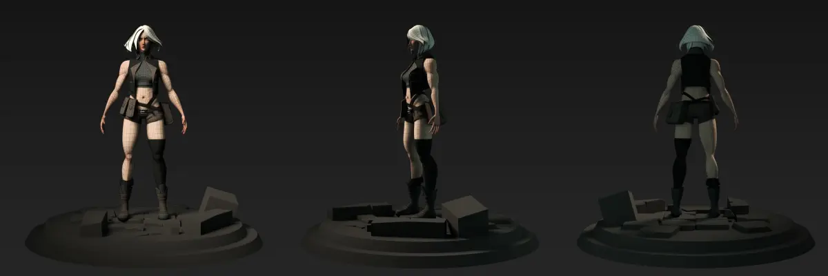 Hello, here is Nach, a mercenary with big armored armsand she's another sketch of mine which I turned it into a 3d model :) _Disclaimer : The files I uploaded contain only the model and textures. I roughly rigged the character so I can pose her and make an illustration on photoshop : you must rig her yourself to get some animation. Sorry :/ _ Here my links : _ https://www.artstation.com/jukushi _ https://jukushi.tumblr.com/ _ https://www.instagram.com/firedskull4/ _