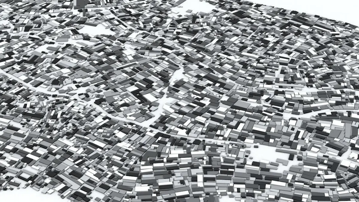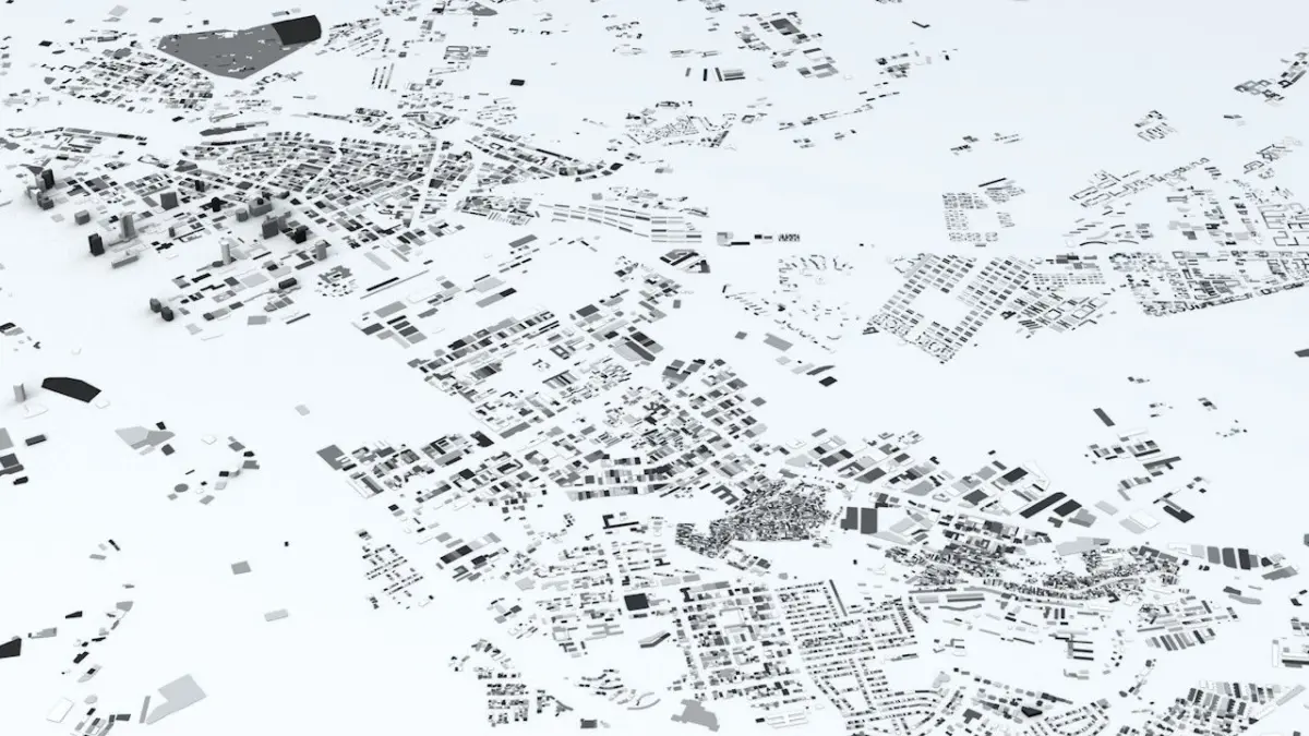 - the model is positioned on a flat surface (all buildings are on the “floor” - no elevation data included)