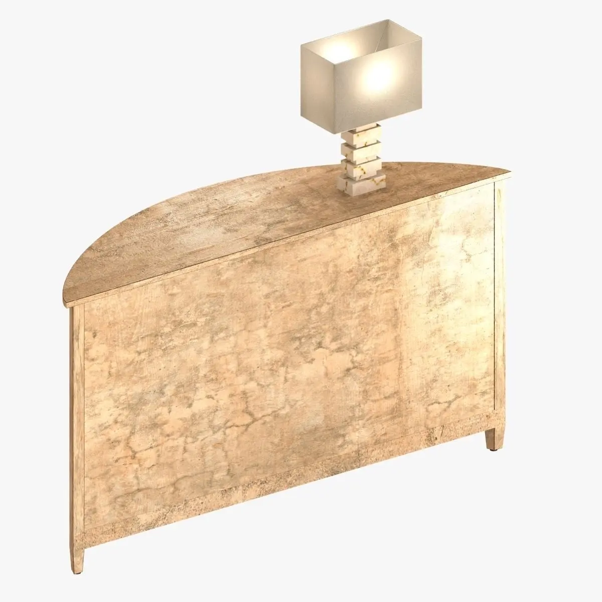 Harelequin Demilune BuffetFour Doors, One Drawer, Five ShelvesFinish: San Marco Creme w/ Hand Painted ChinoiserieStandard Dimensions:Width: 66″Depth: 18″Height: 36″