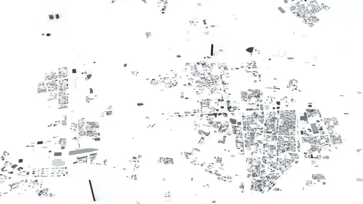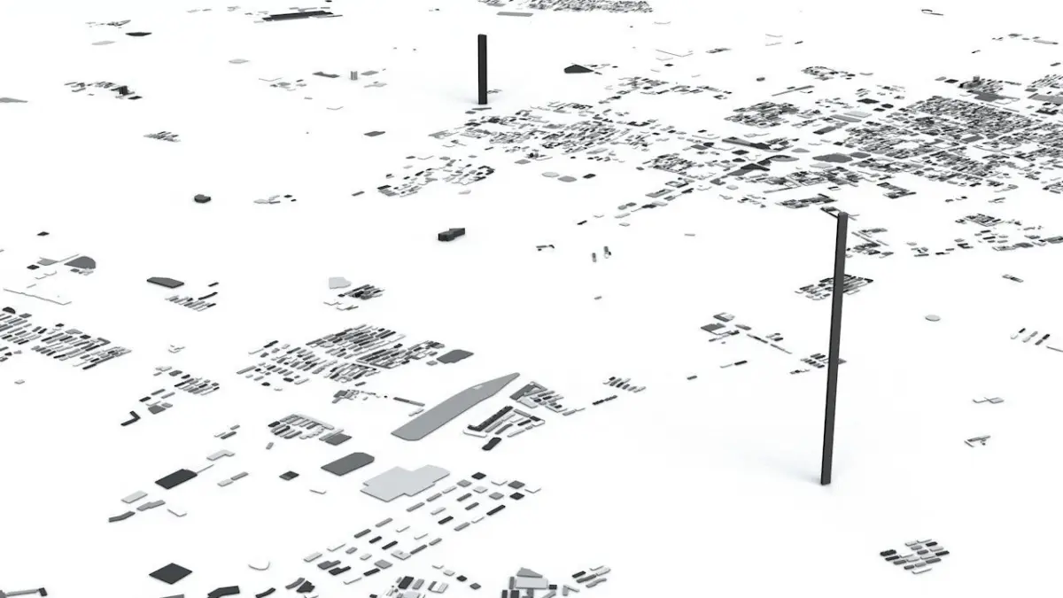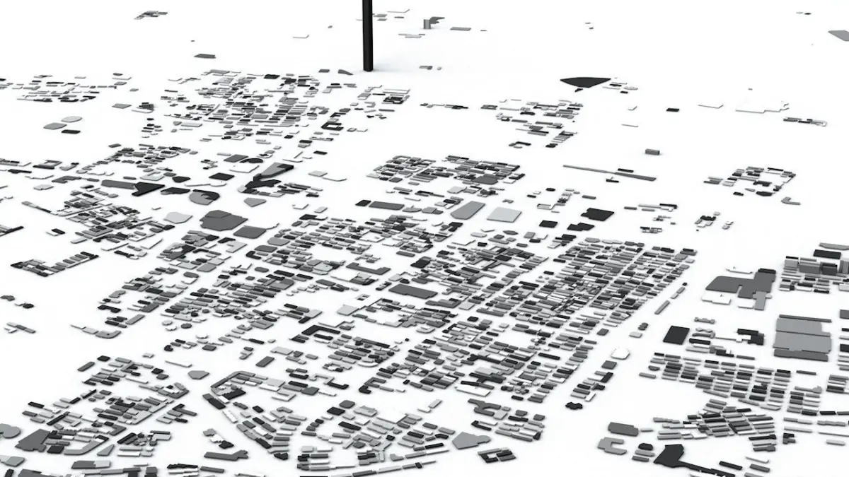 - the model is positioned on a flat surface (all buildings are on the “floor” - no elevation data included)