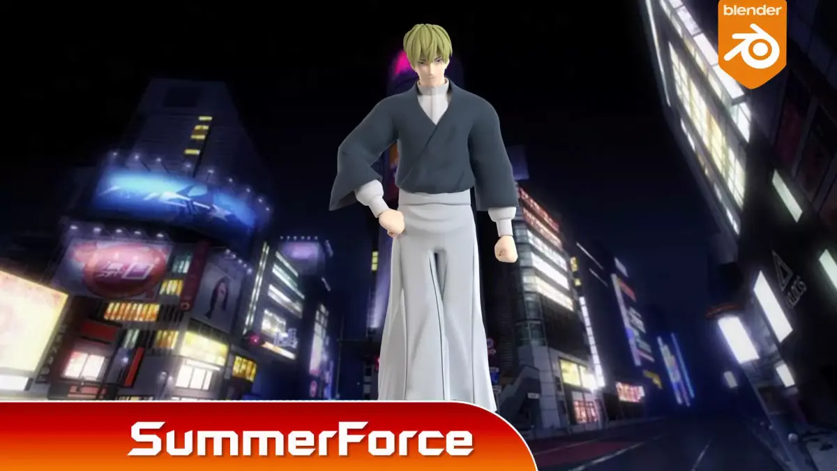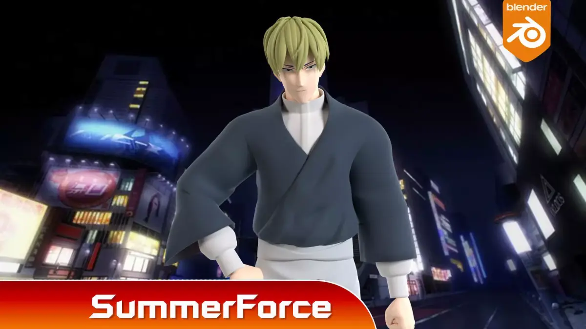 Naoya wears a traditional attire that resembles most of his clan members. He sports a white long-sleeved shirt that buttons the color underneath his teal kimono. He completes his outfit with light-colored hakama bottoms and waraji sandals.