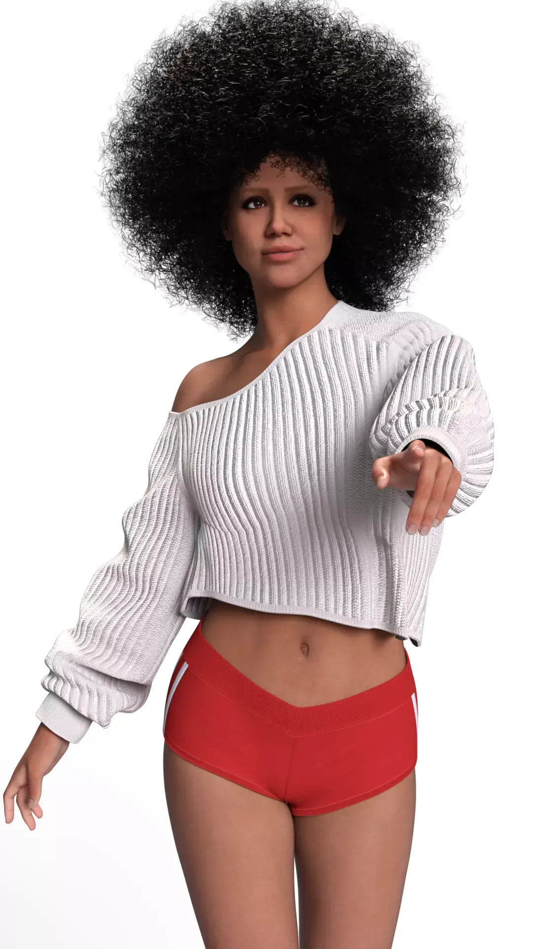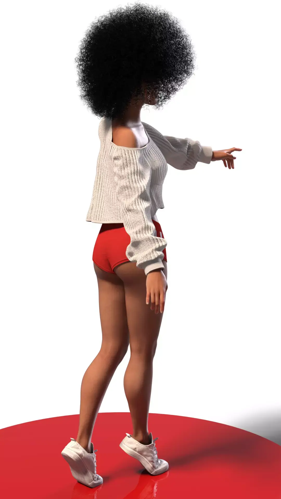 A high-quality 3D render paying tribute to the natural beauty of Nathalie Emmanuel. The most impressive element of this model is the recreation of her iconic afro hair, modeled with exceptional density and volume that captures the real texture. She wears a casual and modern outfit consisting of an oversized white knit sweater with a dropped shoulder, paired with red athletic shorts featuring white side stripes and white sneakers. The pose is dynamic, simulating a step forward on a reflective red circular base, highlighting the skin realism and the actress's athletic proportions.