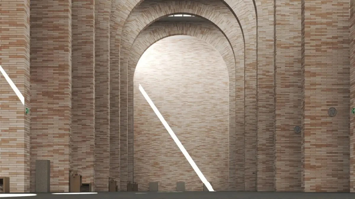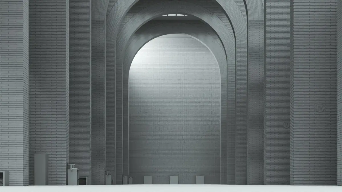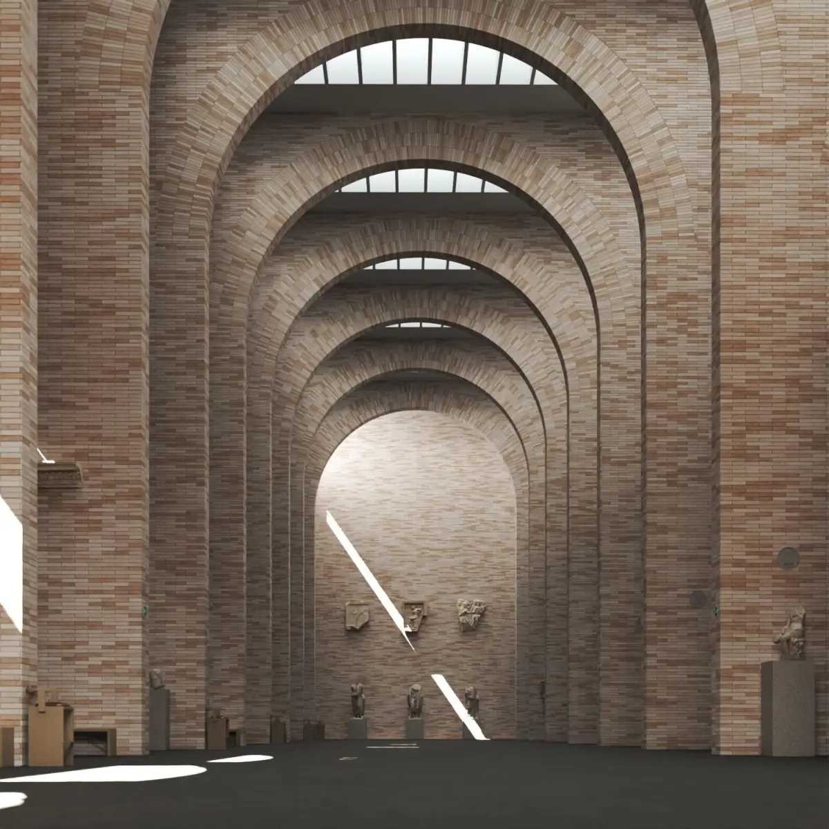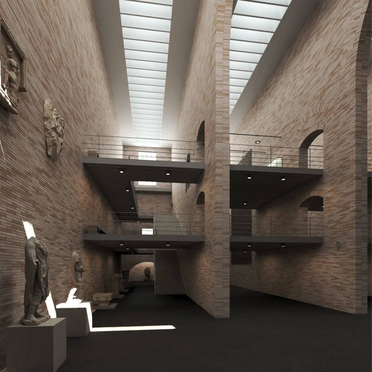 The 3D model of this museum incorporates the main exhibition area, with 10 perpendicular side galleries identified I to X, on 3 levels (Ground Floor, 1st Floor and 2nd Floor). All side galleries communicate with each other through arch shaped openings on the massive interior walls, at each floor. The sunlight comes from the roof window as well as some south facing windows high up in the walls.The omnipresent bricks mimic the roman art style, but still with a very contemporary technique covering concrete-filled walls.The exhibition area was recreated with the goal of achieving the random color distrubition of those bricks, which was only possible in the 3dsmax version, using very heavy vray proxies that stand for the geometries of the whole brick walls covering mortar material walls. The file in itself is quite heavy and can be reduced to what one needs from the model.