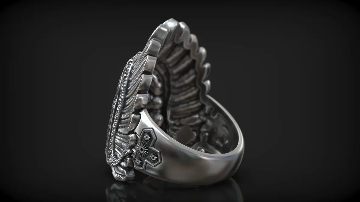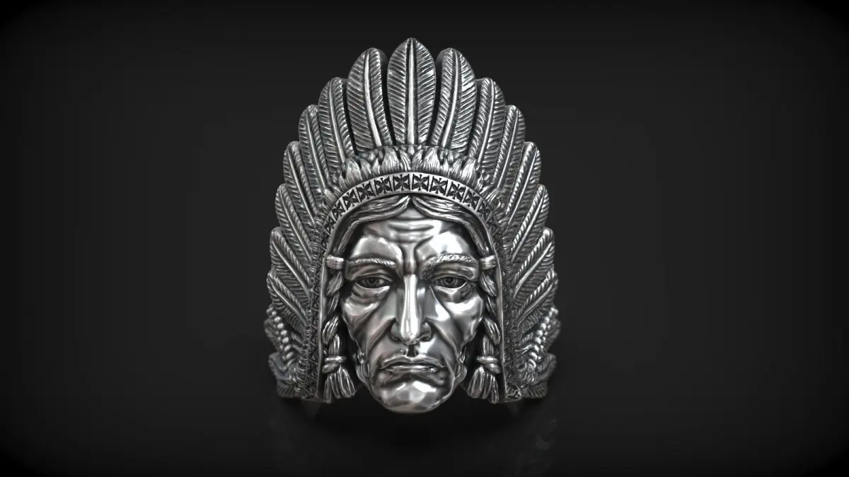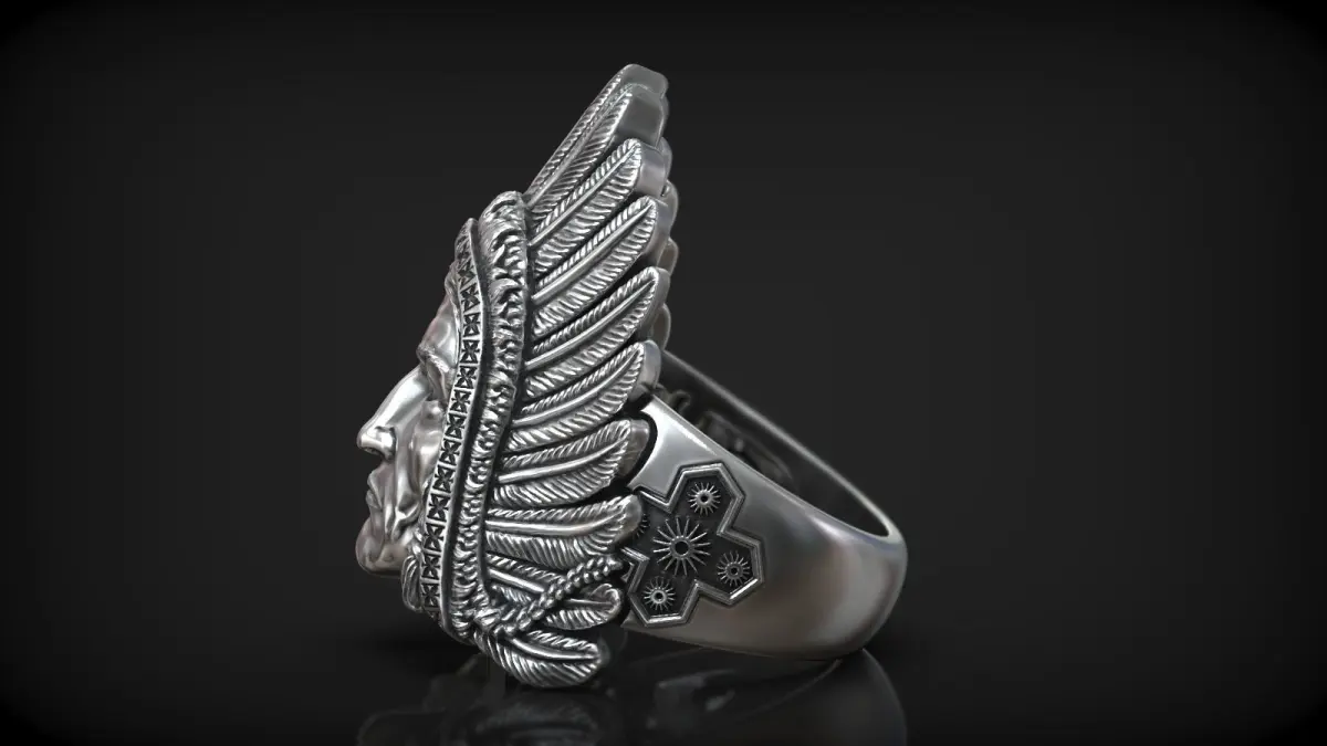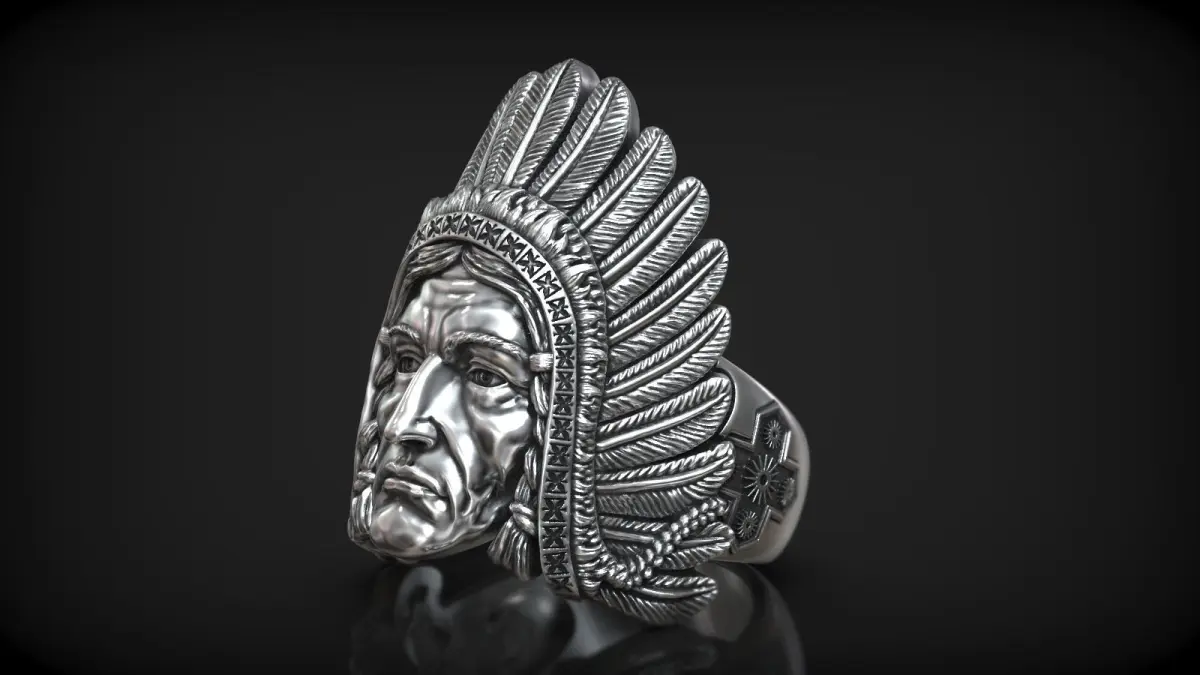 Behold the ring of an Indian chief, featuring a headdress adorned with a plethora of feathers! This marvelous piece caught my eye recently with its intricate design and realistic appearance, crafted from shimmering silver. The headdress stands out in particular, with its colorful and varying lengths of feathers creating depth and dimension, elevating the ring's impressiveness even further. It was designed with comfort in mind, effortlessly fitting onto the finger. Notably, the 3D model of the ring boasts various lighting and shading effects, highlighting its beauty and unique design. Overall, this ring of an Indian chief with a feathered headdress, fashioned from silver, is a stunning and unparalleled piece of jewelry.