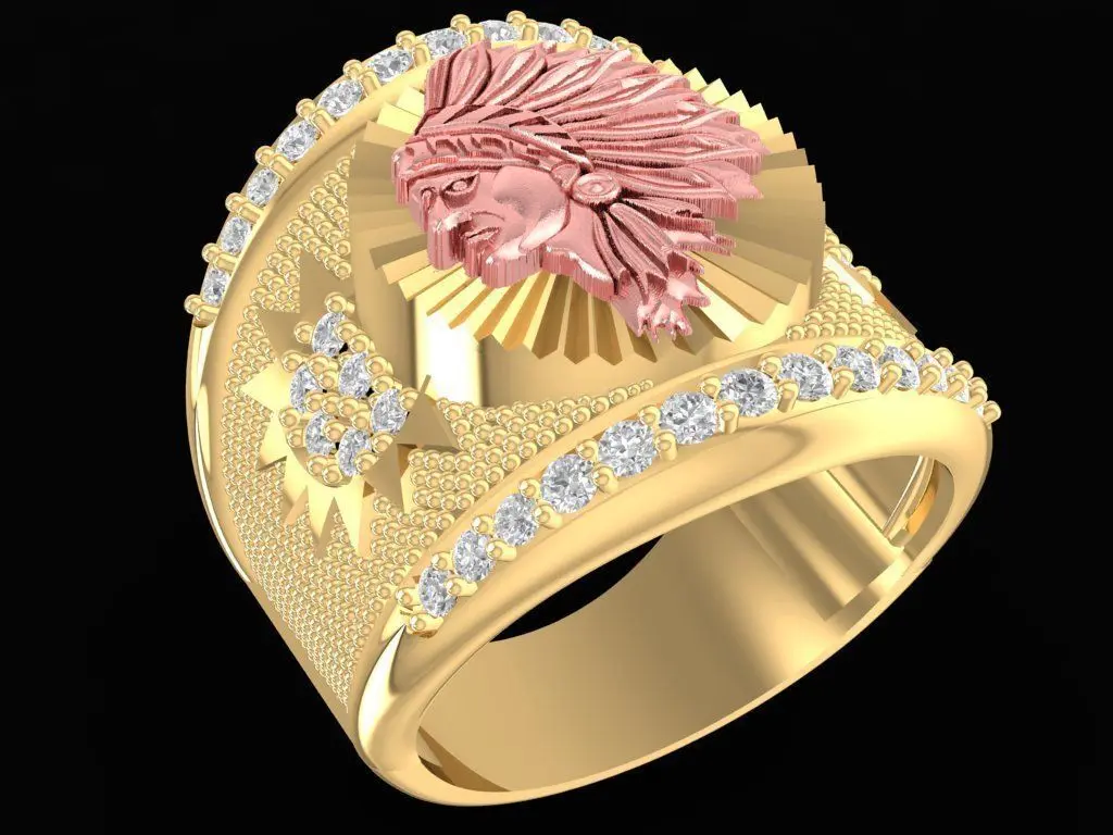 This is a high-quality 3D jewelry model of a statement ring featuring a detailed native chief head motif. The central design showcases a sculpted human face with a feathered headdress, creating a bold and symbolic appearance suitable for luxury or statement jewelry collections.