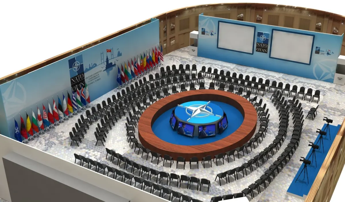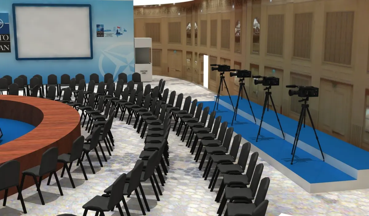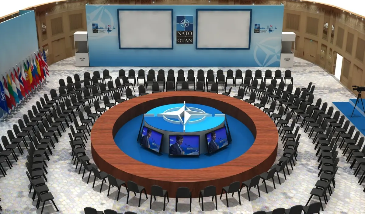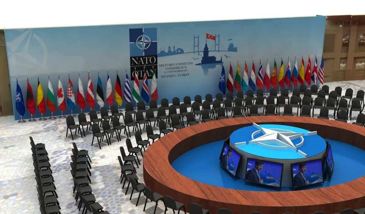 This is a 3d Nato Otan Meeting Stage Decor and seating arrangement setup.