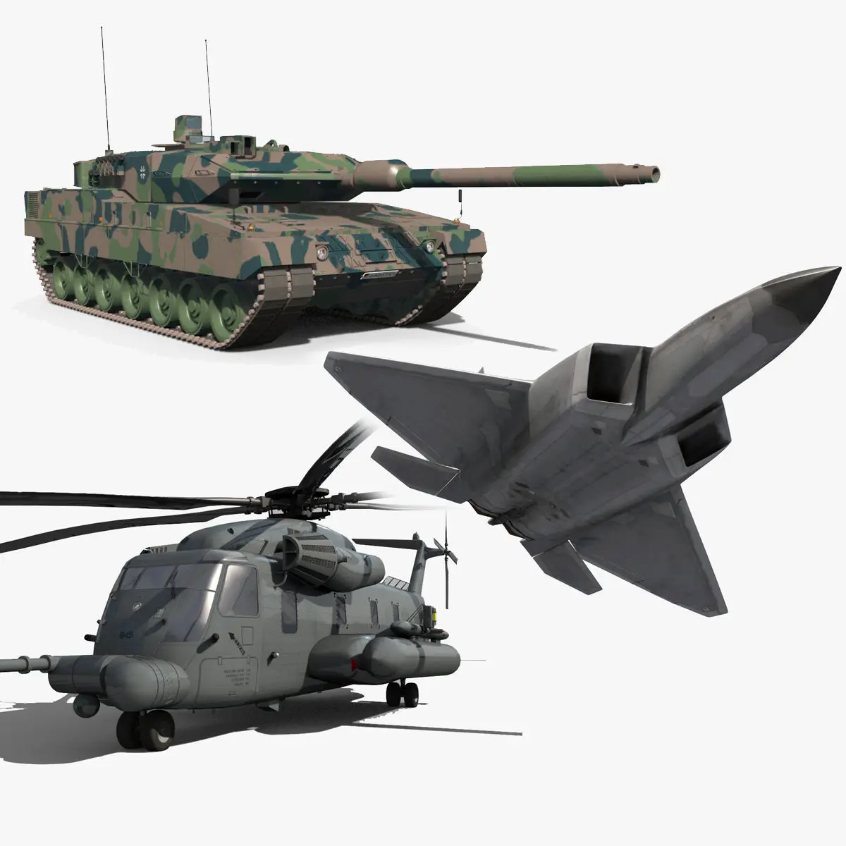 Photorealistic Nato animated 3d models, including Leopard 2 tank, Sikorsky MH-53 Pave Low helicopter and Lockheed Martin F 22 Raptor jet plane. Ready to use.