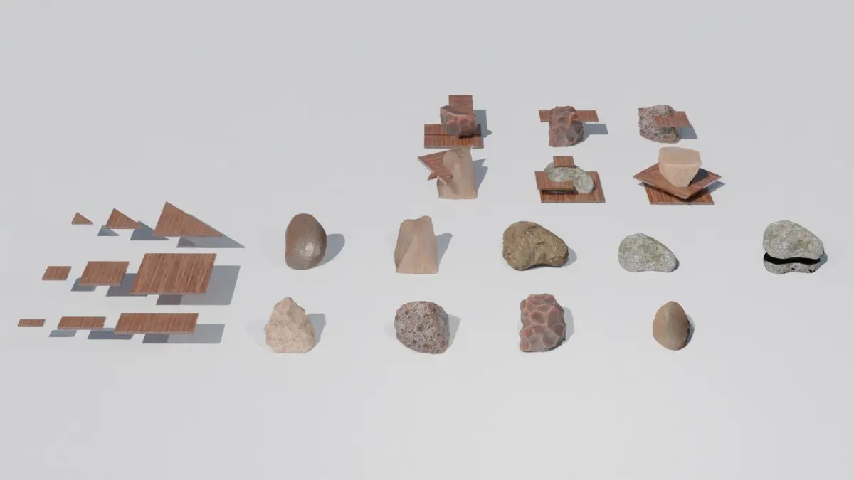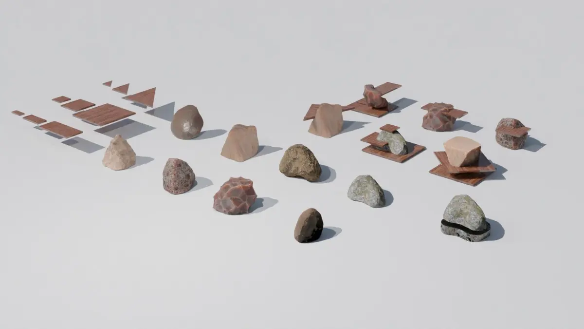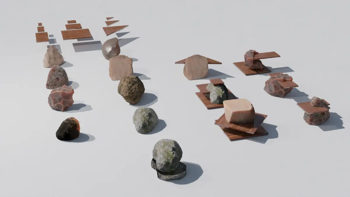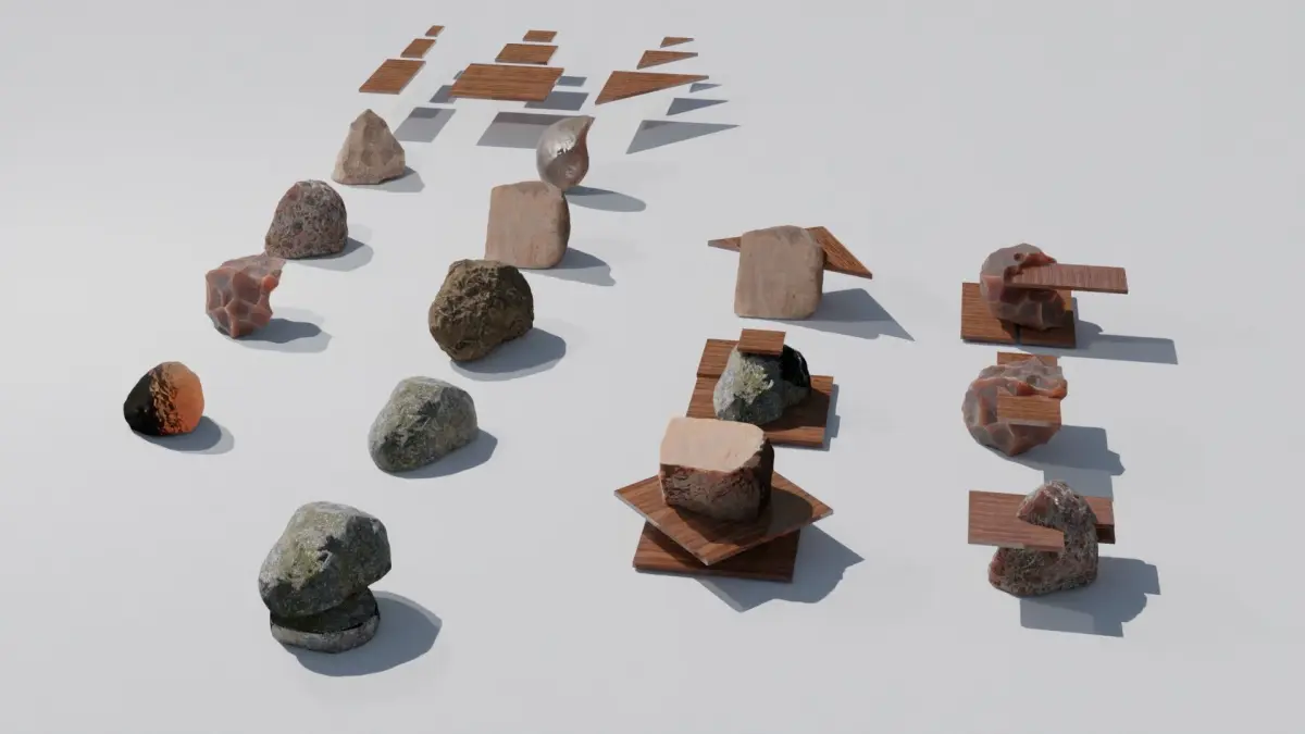 You will get a set of natural rocks with high quality PBR materials. By combining wood panels and stones, you can achieve a wide variety of innovative design tables, sculptures, and chairs that have never been seen before. Additionally, pre-assembled 3D models are provided as examples. Hdri sky is not included. PBR textures and Blender file with materials ready to use are included. 4096x4096 pixels textures: albedo png, AO png, Metalness png, Displacement exr, Normal png, Roughness png. Royalty free license also for commercial use. High poly to low poly: if you need a low poly version of a stone in blender use the decimate modifier to decrease the amount of polygons mantaining the current texture mapping. Enjoy!