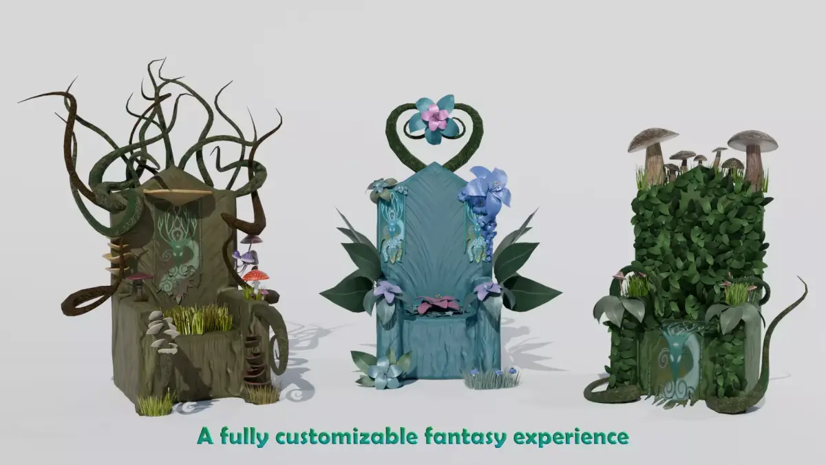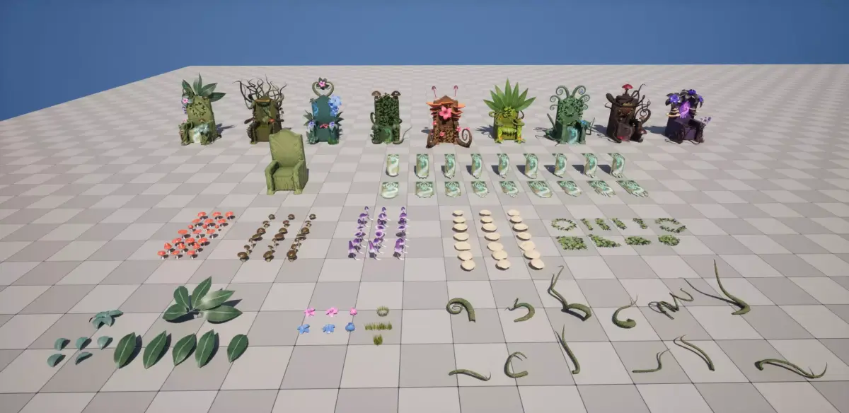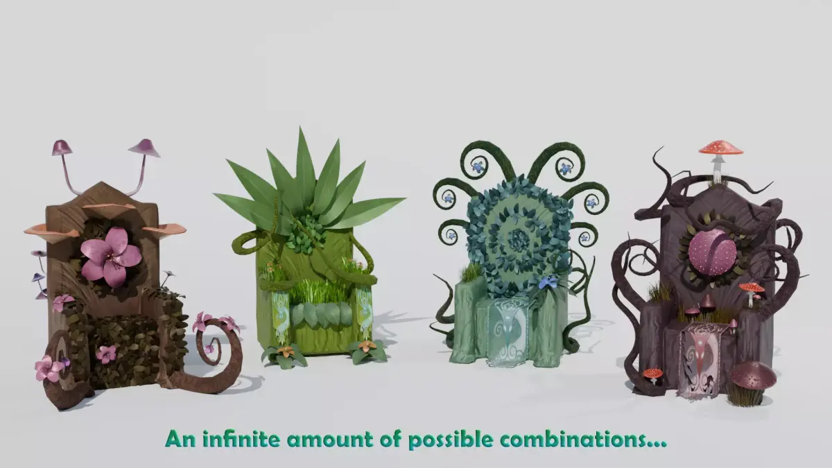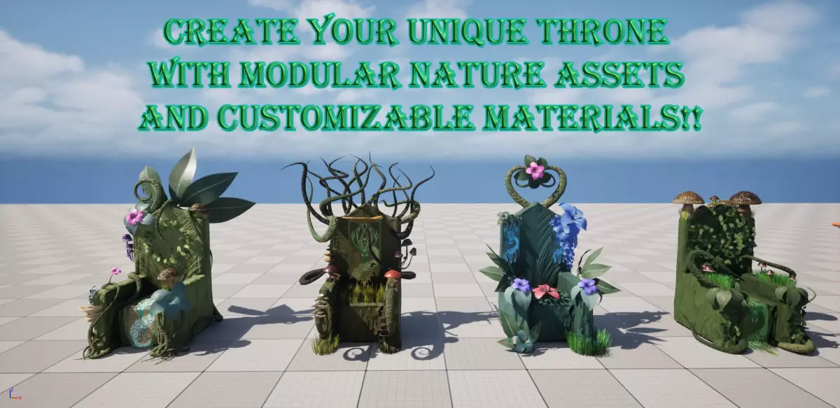 - Fully Modular & Customizable: Build your throne your way and unleash your creativity with dozens of props (plants, flowers, grass, shrooms, roots and even banners) and tweak materials (color, roughness, normals) in seconds