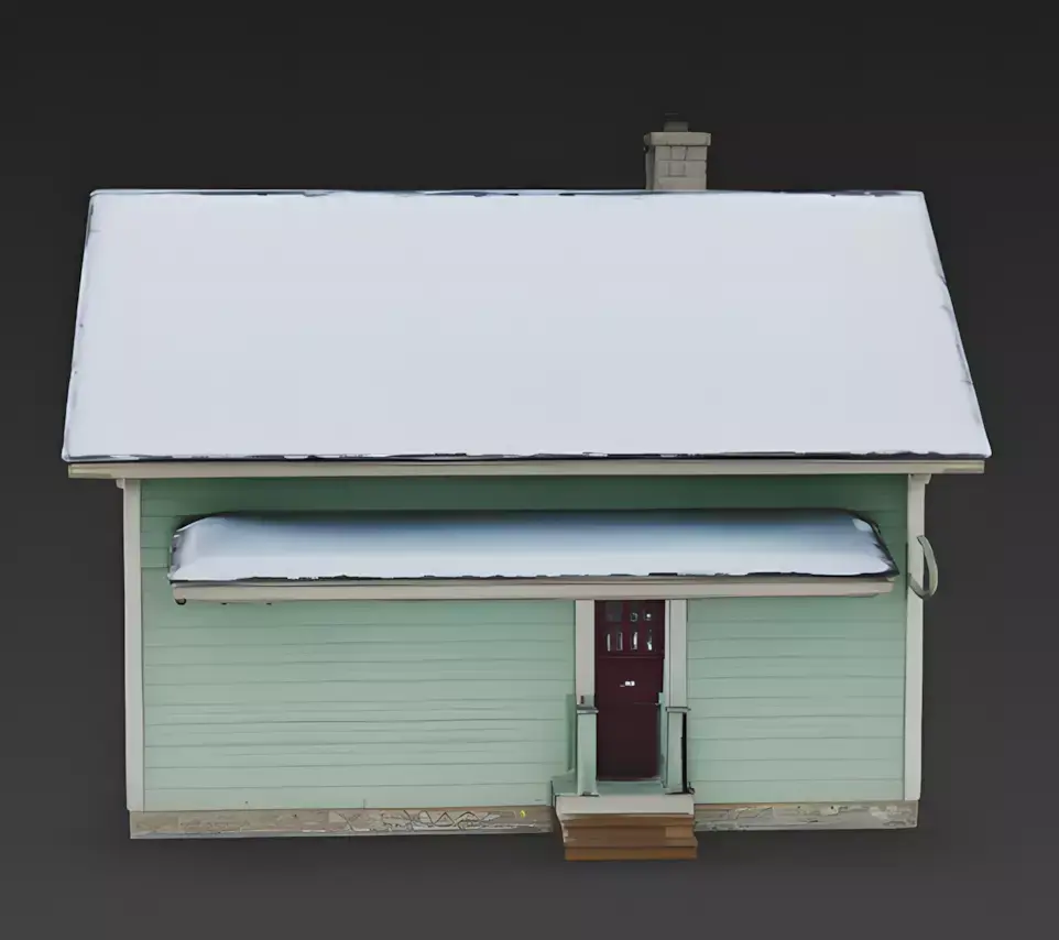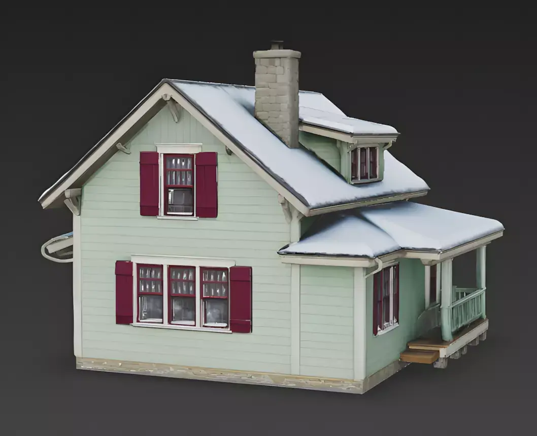 Towering Pine Trees The house is framed by large, snow-covered pine trees on both sides. These environmental elements are included to show how the asset fits into a forest setting, enhancing the cozy, secluded atmosphere.