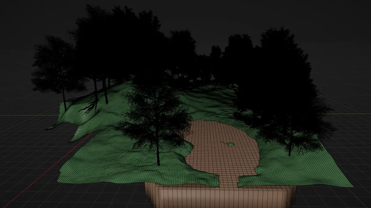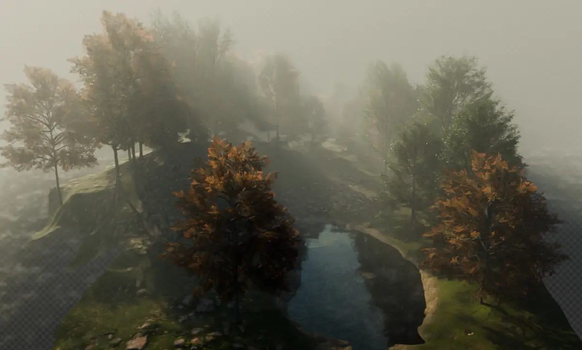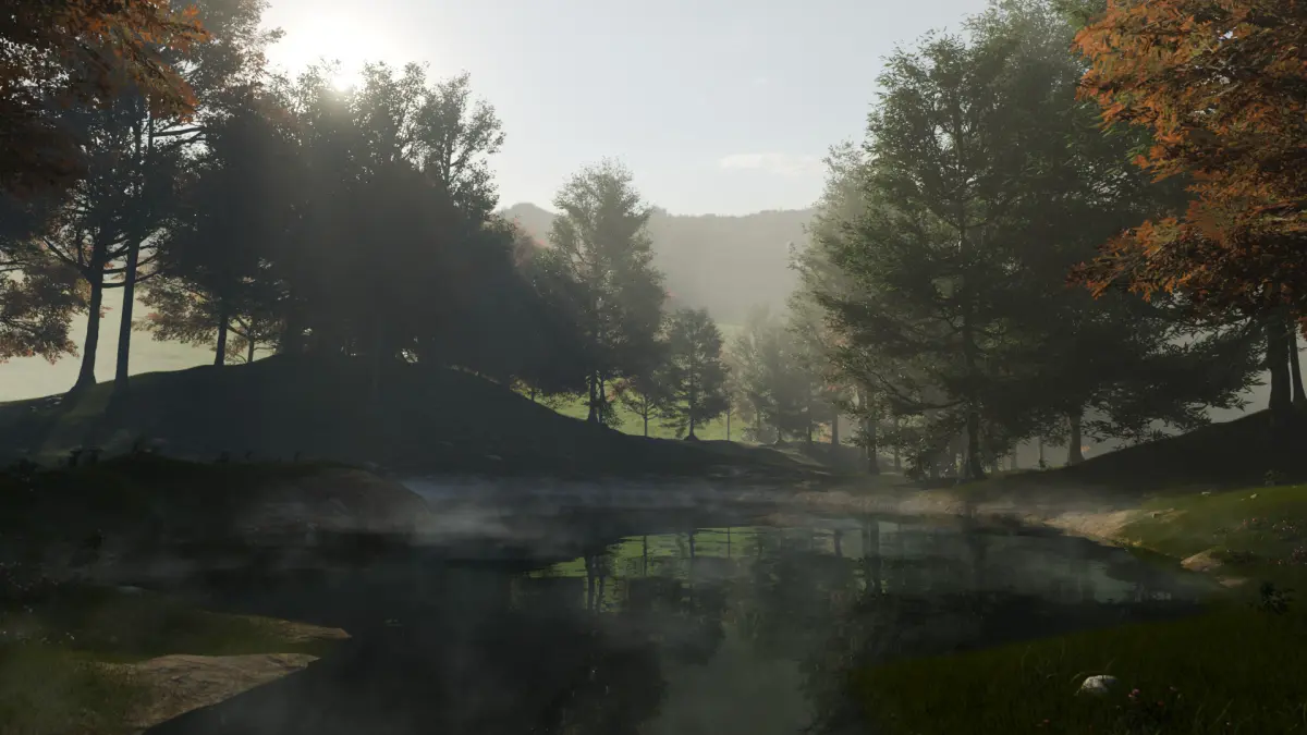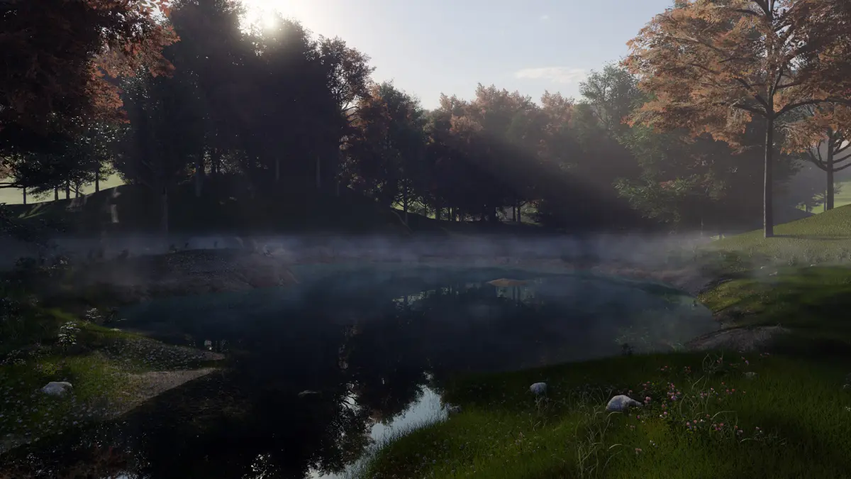A Landscape, a shiny day, foggy, water, grass, trees, and beautiful sun godray.Use geometry node.Material and Texture embeded in blender file.