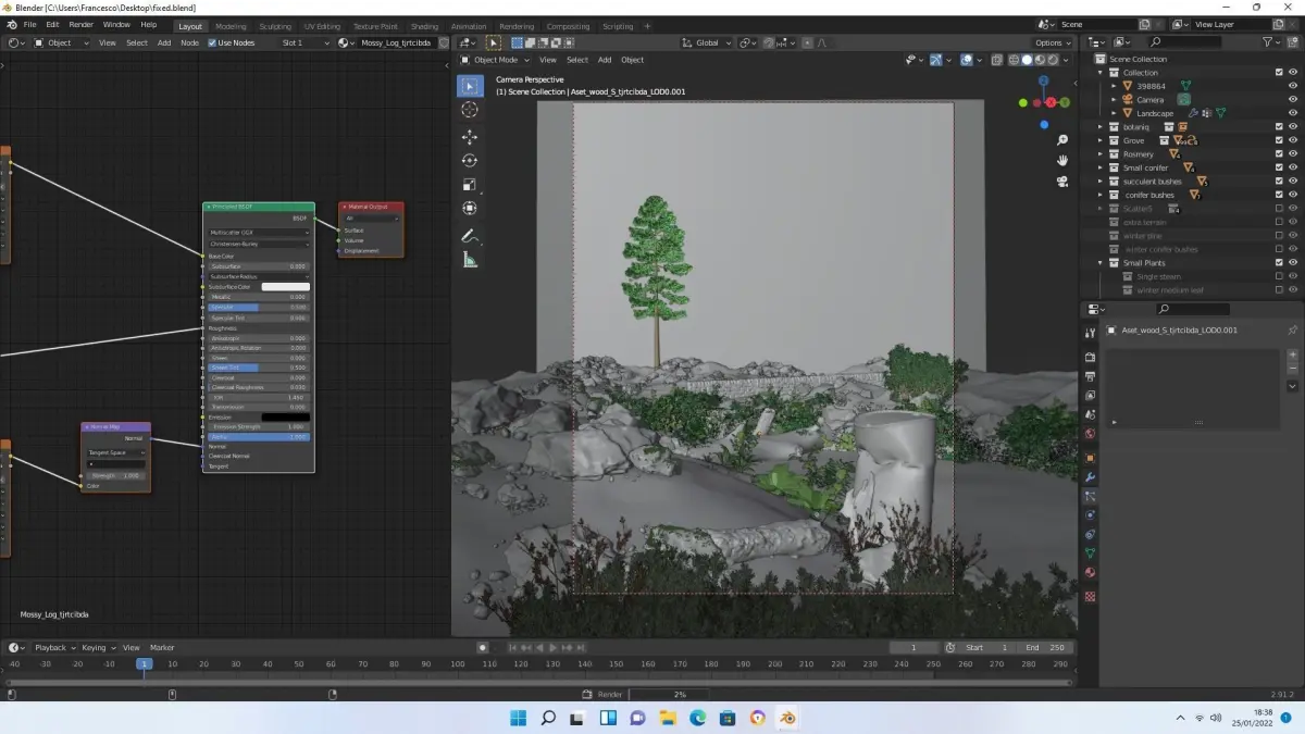 In the .blend file there are multiples collections of natural objects such as bushes, leaves, trees and plants. In the render published you can see how some of them where used to create a photorealistic panorama, wich is included in the package.Note: The textures are all packed in the .blend file. If you want the .png file of a texture you have to select an image in the Image Editor and go to Image->Save As...There are textures for the Normal values, the Roughness valus and the Diffuse values for each included 3d model. As you can see from the previews image, there are multiple collection, one for each kind of natural asset.