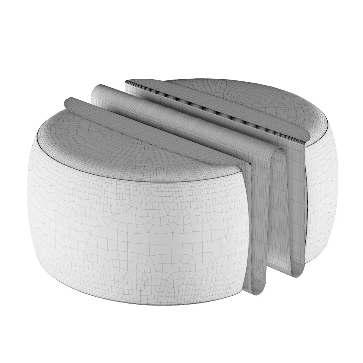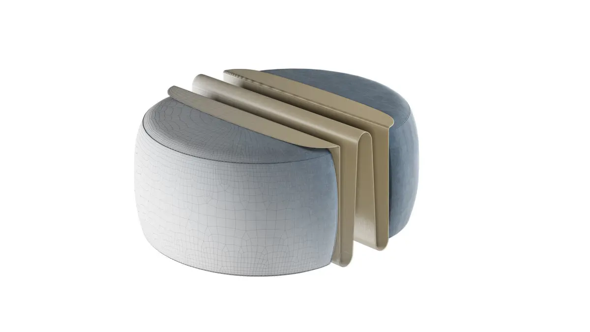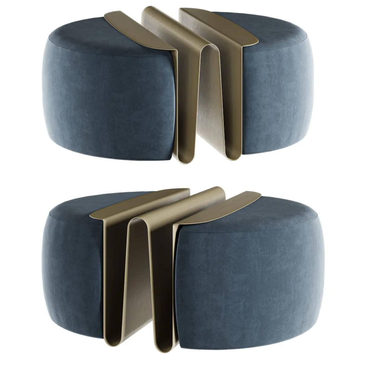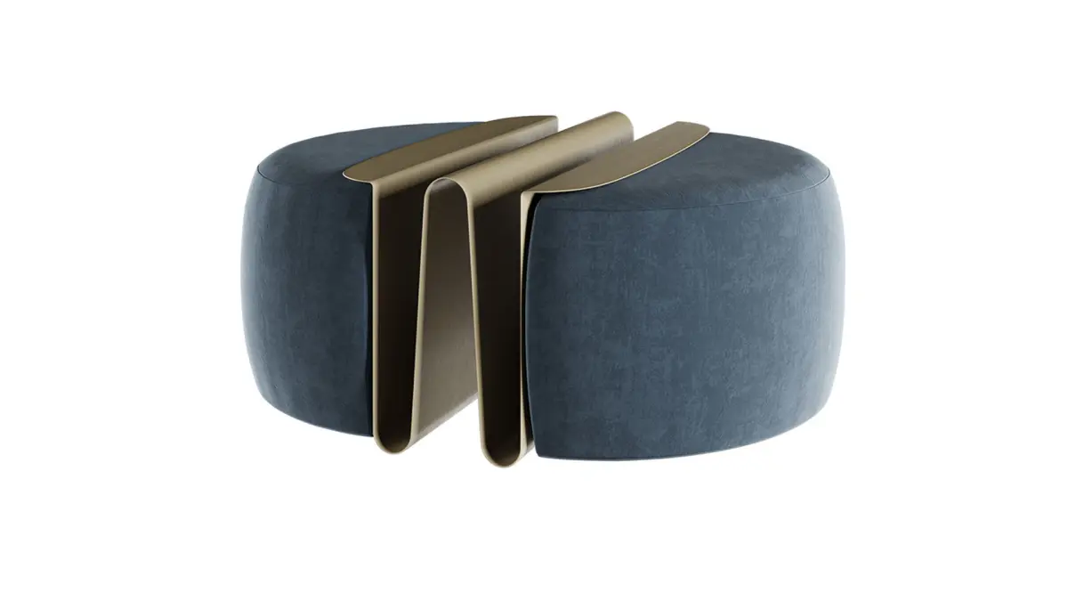 The Wave pouf is composed of two half-moon elements and an elegant central magazine rack, comprised of curved, laser-cut steel sheeting, polished and powder-coated with a light gold finish and a smooth, opaque texture.